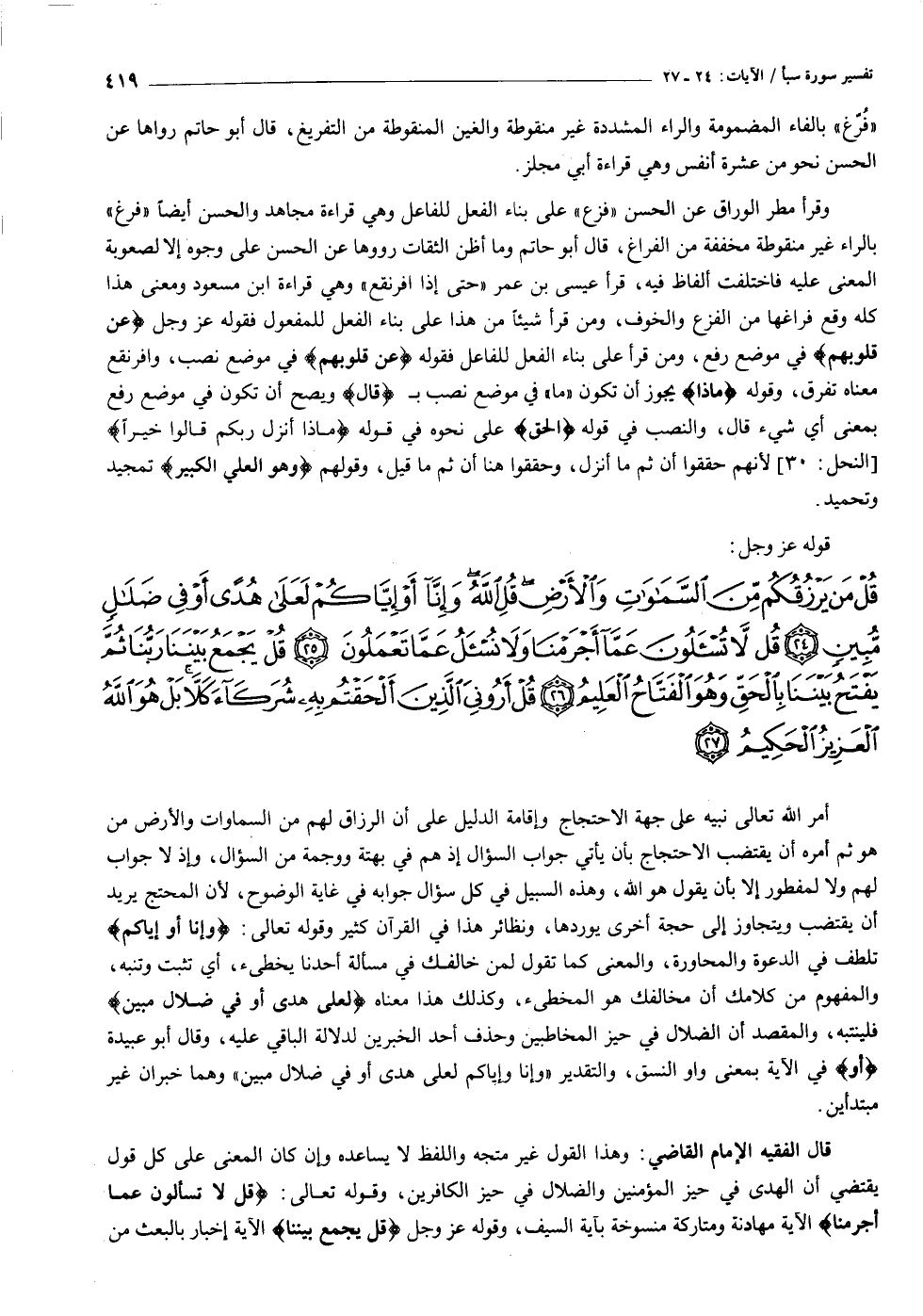 قُلْ مَنْ يَرْزُقُكُمْ مِنَ السَّماواتِ وَالْأَرْضِ قُلِ اللَّهُ وَإِنَّا أَوْ إِيَّاكُمْ لَعَلى هُدىً أَوْ فِي ضَلالٍ مُبِينٍ (٢٤) قُلْ لا تُسْئَلُونَ عَمَّا أَجْرَمْنا وَلا نُسْئَلُ عَمَّا تَعْمَلُونَ (٢٥) قُلْ يَجْمَعُ بَيْنَنا رَبُّنا ثُمَّ يَفْتَحُ بَيْنَنا بِالْحَقِّ وَهُوَ الْفَتَّاحُ الْعَلِيمُ (٢٦) قُلْ أَرُونِيَ الَّذِينَ أَلْحَقْتُمْ بِهِ شُرَكاءَ كَلاَّ بَلْ هُوَ اللَّهُ الْعَزِيزُ الْحَكِيمُ (٢٧)