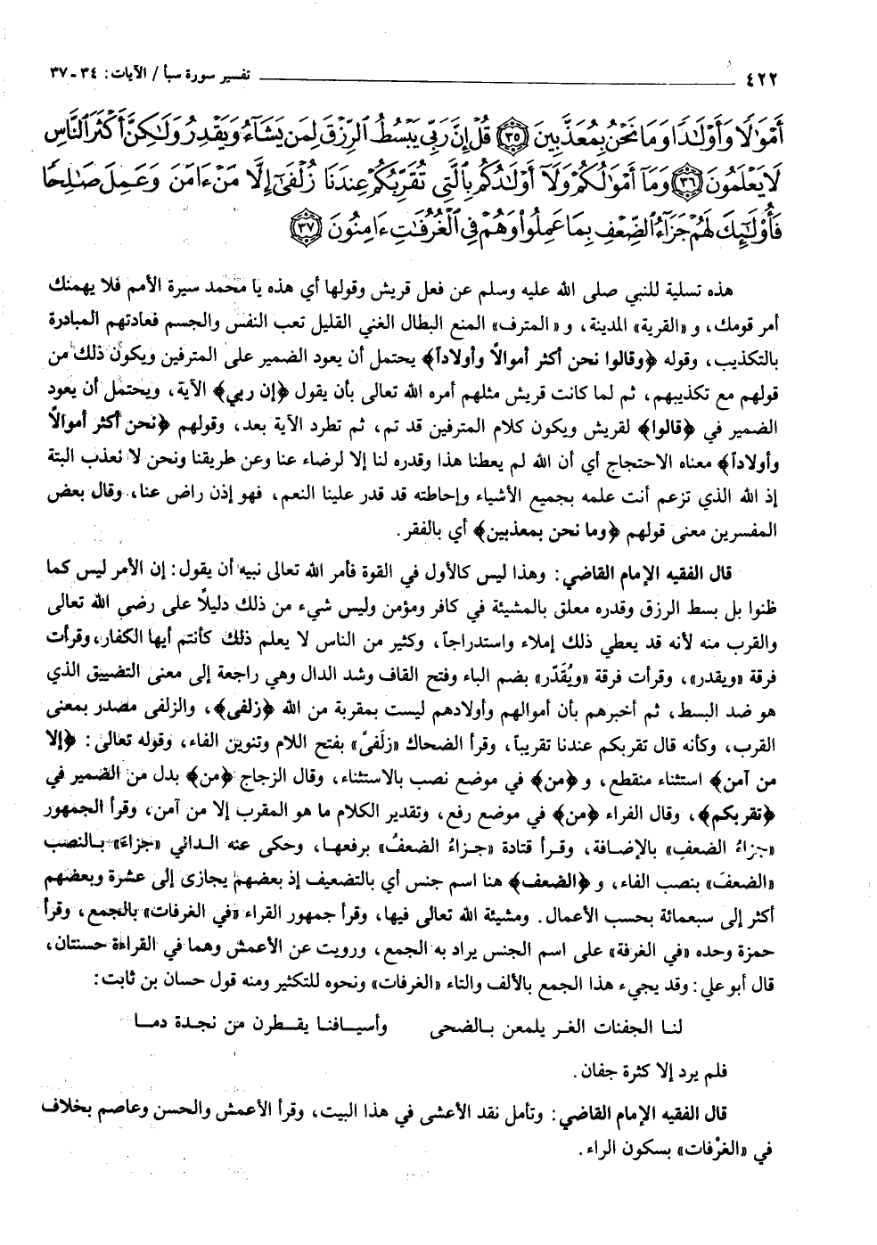 قال الفقيه الإمام القاضي: وهذا ليس كالأول في القوة فأمر الله تعالى نبيه أن يقول: إن الأمر ليس كما ظنوا بل بسط الرزق وقدره معلق بالمشيئة في كافر ومؤمن وليس شيء من ذلك دليلا على رضى الله تعالى والقرب منه لأنه قد يعطي ذلك إملاء واستدراجا، وكثير من الناس لا يعلم ذلك كأنتم أيها الكفار، وقرأت فرقة «ويقدر» ، وقرأت فرقة «ويقدّر» بضم الباء وفتح القاف وشد الدال وهي راجعة إلى معنى التضييق الذي هو ضد البسط، ثم أخبرهم بأن أموالهم وأولادهم ليست بمقربة من الله زُلْفى، والزلفى مصدر بمعنى القرب، وكأنه قال تقربكم عندنا تقريبا، وقرأ الضحاك «زلفى» بفتح اللام وتنوين الفاء، وقوله تعالى: إِلَّا مَنْ آمَنَ استثناء منقطع، ومَنْ في موضع نصب بالاستثناء، وقال الزجاج مَنْ بدل من الضمير في تُقَرِّبُكُمْ، وقال الفراء مَنْ في موضع رفع، وتقدير الكلام ما هو المقرب إلا من آمن، وقرأ الجمهور «جزاء الضعف» بالإضافة، وقرأ قتادة «جزاء الضعف» برفعها، وحكى عنه الداني «جزاء» بالنصب «الضعف» بنصب الفاء، والضِّعْفِ هنا اسم جنس أي بالتضعيف إذ بعضهم يجازى إلى عشرة وبعضهم أكثر إلى سبعمائة بحسب الأعمال. ومشيئة الله تعالى فيها، وقرأ جمهور القراء «في الغرفات» بالجمع، وقرأ حمزة وحده «في الغرفة» على اسم الجنس يراد به الجمع، ورويت عن الأعمش وهما في القراءة حسنتان، قال أبو علي: وقد يجيء هذا الجمع بالألف والتاء «الغرفات» ونحوه للتكثير ومنه قول حسان بن ثابت: