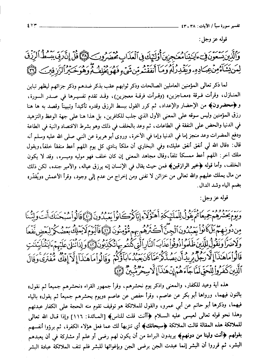 وَيَوْمَ يَحْشُرُهُمْ جَمِيعاً ثُمَّ يَقُولُ لِلْمَلائِكَةِ أَهؤُلاءِ إِيَّاكُمْ كانُوا يَعْبُدُونَ (٤٠) قالُوا سُبْحانَكَ أَنْتَ وَلِيُّنا مِنْ دُونِهِمْ بَلْ كانُوا يَعْبُدُونَ الْجِنَّ أَكْثَرُهُمْ بِهِمْ مُؤْمِنُونَ (٤١) فَالْيَوْمَ لا يَمْلِكُ بَعْضُكُمْ لِبَعْضٍ نَفْعاً وَلا ضَرًّا وَنَقُولُ لِلَّذِينَ ظَلَمُوا ذُوقُوا عَذابَ النَّارِ الَّتِي كُنْتُمْ بِها تُكَذِّبُونَ (٤٢) وَإِذا تُتْلى عَلَيْهِمْ آياتُنا بَيِّناتٍ قالُوا ما هذا إِلاَّ رَجُلٌ يُرِيدُ أَنْ يَصُدَّكُمْ عَمَّا كانَ يَعْبُدُ آباؤُكُمْ وَقالُوا ما هذا إِلاَّ إِفْكٌ مُفْتَرىً وَقالَ الَّذِينَ كَفَرُوا لِلْحَقِّ لَمَّا جاءَهُمْ إِنْ هذا إِلاَّ سِحْرٌ مُبِينٌ (٤٣)