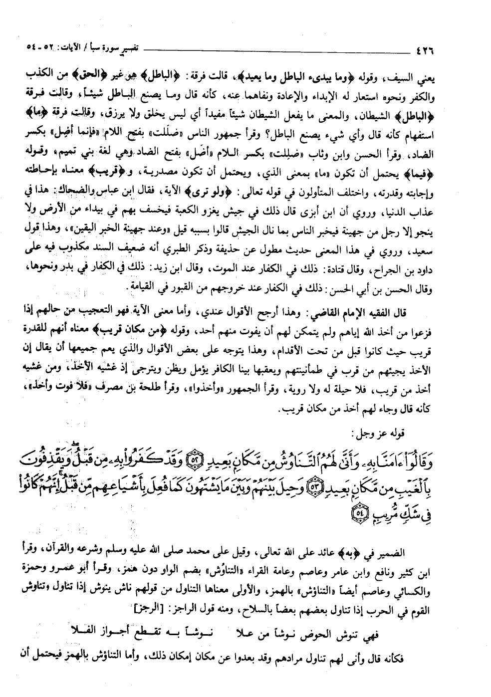 يعني السيف، وقوله وَما يُبْدِئُ الْباطِلُ وَما يُعِيدُ، قالت فرقة: الْباطِلُ هو غير الْحَقُّ من الكذب والكفر ونحوه استعار له الإبداء والإعادة ونفاهما عنه، كأنه قال وما يصنع الباطل شيئا، وقالت فرقة الْباطِلُ الشيطان، والمعنى ما يفعل الشيطان شيئا مفيدا أي ليس يخلق ولا يرزق، وقالت فرقة ما استفهام كأنه قال وأي شيء يصنع الباطل؟ وقرأ جمهور الناس «ضللت» بفتح اللام «فإنما أضل» بكسر الضاد، وقرأ الحسن وابن وثاب «ضللت» بكسر اللام «أضل» بفتح الضاد وهي لغة بني تميم، وقوله فَبِما يحتمل أن تكون «ما» بمعنى الذي، ويحتمل أن تكون مصدرية، وقَرِيبٌ معناه بإحاطته وإجابته وقدرته، واختلف المتأولون في قوله تعالى: وَلَوْ تَرى الآية، فقال ابن عباس والضحاك: هذا في عذاب الدنيا، وروي أن ابن أبزى قال ذلك في جيش يغزو الكعبة فيخسف بهم في بيداء من الأرض ولا ينجو إلا رجل من جهينة فيخبر الناس بما نال الجيش قالوا بسببه قيل «وعند جهينة الخبر اليقين» ، وهذا قول سعيد، وروي في هذا المعنى حديث مطول عن حذيفة وذكر الطبري أنه ضعيف السند مكذوب فيه على داود بن الجراح، وقال قتادة: ذلك في الكفار عند الموت، وقال ابن زيد: ذلك في الكفار في بدر ونحوها، وقال الحسن بن أبي الحسن: ذلك في الكفار عند خروجهم من القبور في القيامة.