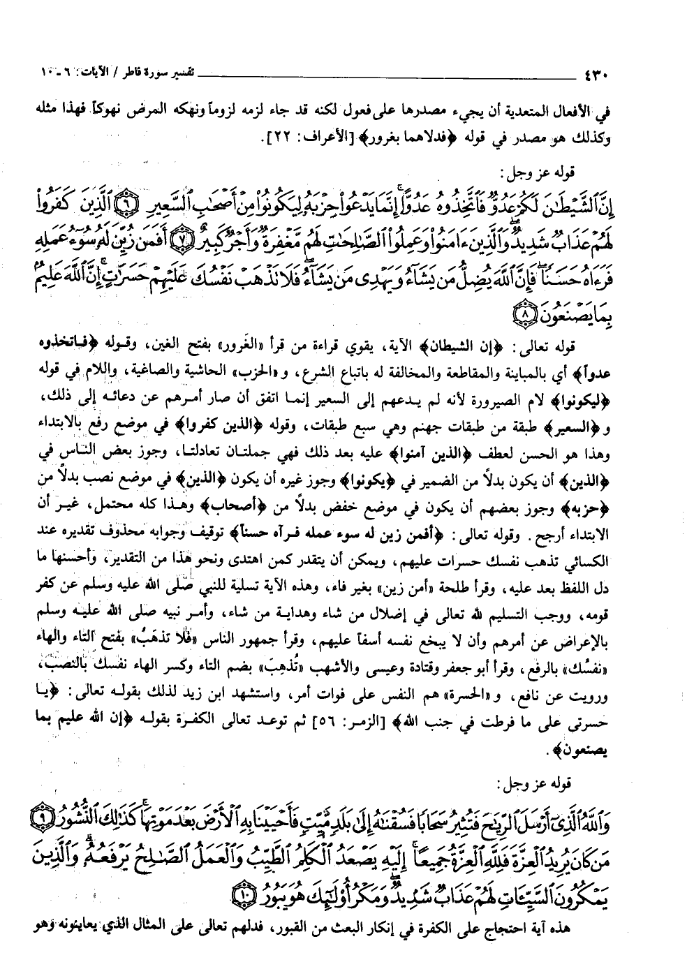 إِنَّ الشَّيْطانَ لَكُمْ عَدُوٌّ فَاتَّخِذُوهُ عَدُوًّا إِنَّما يَدْعُوا حِزْبَهُ لِيَكُونُوا مِنْ أَصْحابِ السَّعِيرِ (٦) الَّذِينَ كَفَرُوا لَهُمْ عَذابٌ شَدِيدٌ وَالَّذِينَ آمَنُوا وَعَمِلُوا الصَّالِحاتِ لَهُمْ مَغْفِرَةٌ وَأَجْرٌ كَبِيرٌ (٧) أَفَمَنْ زُيِّنَ لَهُ سُوءُ عَمَلِهِ فَرَآهُ حَسَناً فَإِنَّ اللَّهَ يُضِلُّ مَنْ يَشاءُ وَيَهْدِي مَنْ يَشاءُ فَلا تَذْهَبْ نَفْسُكَ عَلَيْهِمْ حَسَراتٍ إِنَّ اللَّهَ عَلِيمٌ بِما يَصْنَعُونَ (٨)