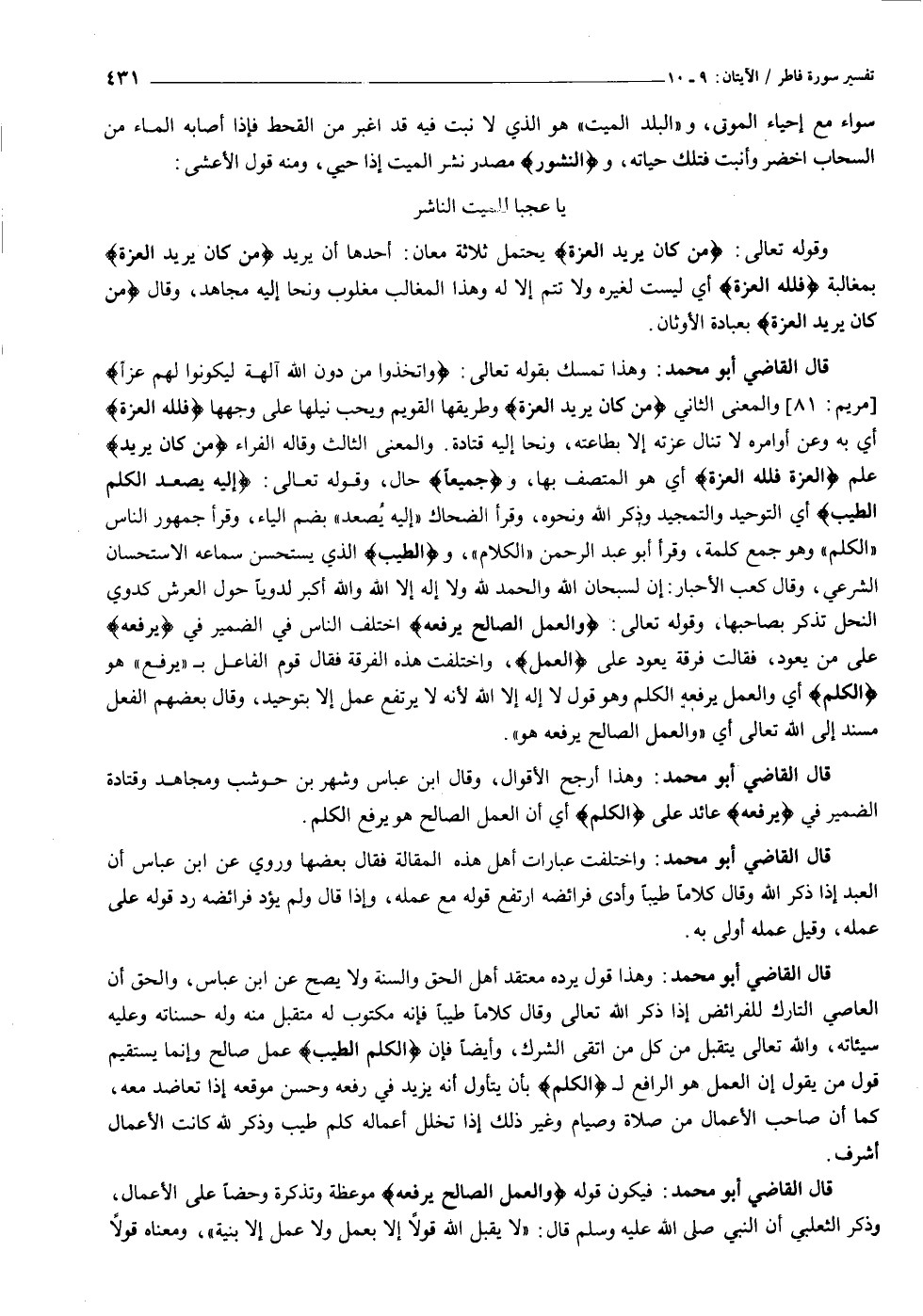 يا عجبا للميت الناشر وقوله تعالى: مَنْ كانَ يُرِيدُ الْعِزَّةَ يحتمل ثلاثة معان: أحدها أن يريد مَنْ كانَ يُرِيدُ الْعِزَّةَ بمغالبة فَلِلَّهِ الْعِزَّةُ أي ليست لغيره ولا تتم إلا له وهذا المغالب مغلوب ونحا إليه مجاهد، وقال مَنْ كانَ يُرِيدُ الْعِزَّةَ بعبادة الأوثان.