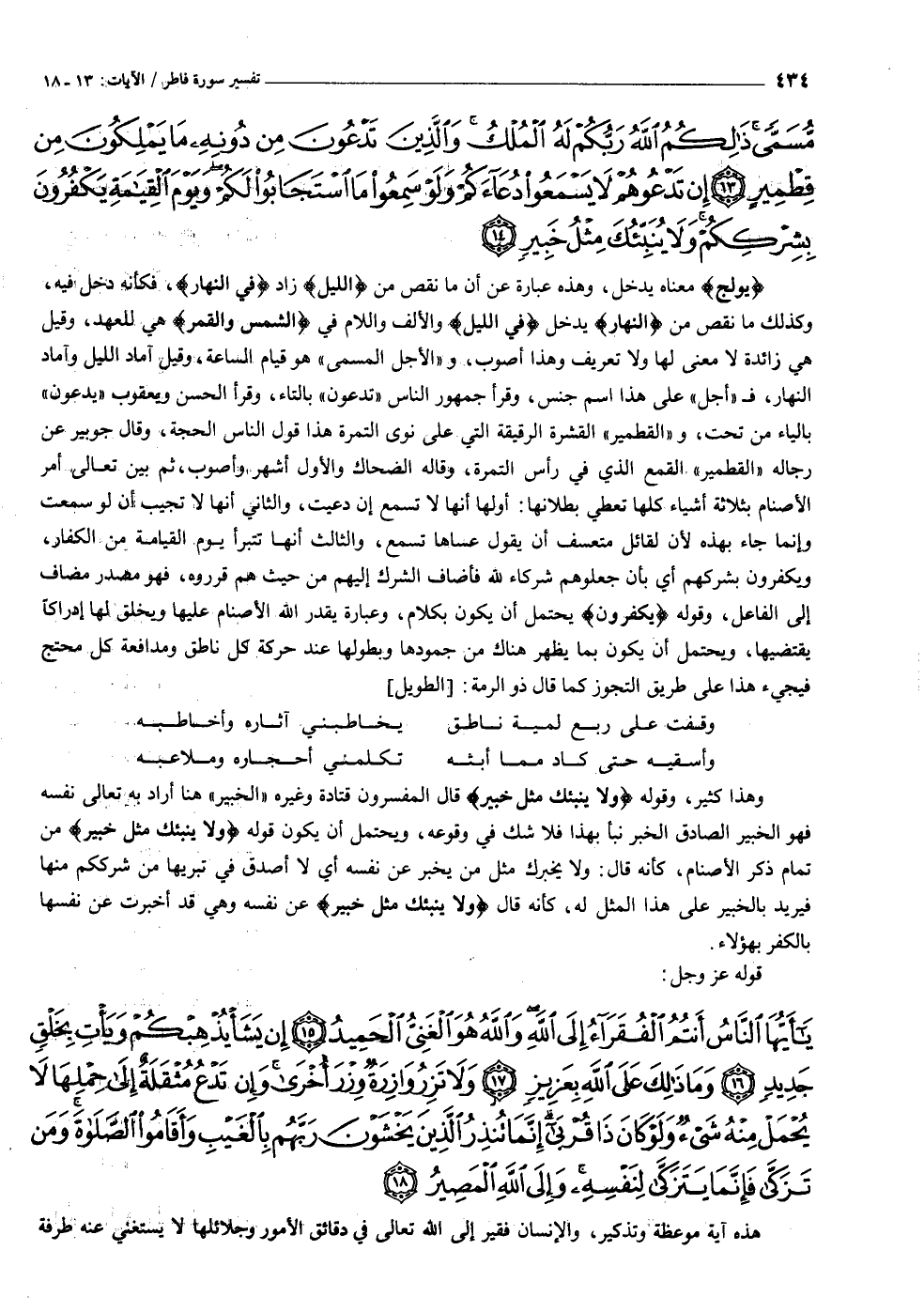 يُولِجُ اللَّيْلَ فِي النَّهارِ وَيُولِجُ النَّهارَ فِي اللَّيْلِ وَسَخَّرَ الشَّمْسَ وَالْقَمَرَ كُلٌّ يَجْرِي لِأَجَلٍ مُسَمًّى ذلِكُمُ اللَّهُ رَبُّكُمْ لَهُ الْمُلْكُ وَالَّذِينَ تَدْعُونَ مِنْ دُونِهِ ما يَمْلِكُونَ مِنْ قِطْمِيرٍ (١٣) إِنْ تَدْعُوهُمْ لا يَسْمَعُوا دُعاءَكُمْ وَلَوْ سَمِعُوا مَا اسْتَجابُوا لَكُمْ وَيَوْمَ الْقِيامَةِ يَكْفُرُونَ بِشِرْكِكُمْ وَلا يُنَبِّئُكَ مِثْلُ خَبِيرٍ (١٤)