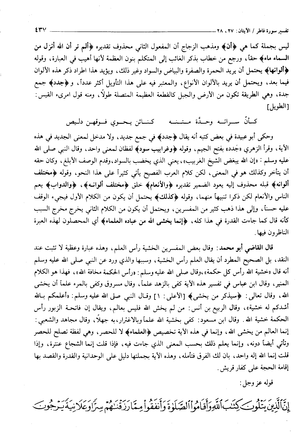 وحكى أبو عبيدة في بعض كتبه أنه يقال جُدَدٌ في جمع جديد، ولا مدخل لمعنى الجديد في هذه الآية، وقرأ الزهري «جدد» بفتح الجيم، وقوله وَغَرابِيبُ سُودٌ لفظان لمعنى واحد، وقال النبي صلى الله عليه وسلم: «إن الله يبغض الشيخ الغربيب» ، يعني الذي يخضب بالسواد، وقدم الوصف الأبلغ، وكان حقه أن يتأخر وكذلك هو في المعنى، لكن كلام العرب الفصيح يأتي كثيرا على هذا النحو، وقوله مُخْتَلِفٌ أَلْوانُهُ قبله محذوف إليه يعود الضمير تقديره وَالْأَنْعامِ خلق مُخْتَلِفٌ أَلْوانُهُ، وَالدَّوَابِّ يعم الناس والأنعام لكن ذكرا تنبيها منهما، وقوله كَذلِكَ يحتمل أن يكون من الكلام الأول فيجيء الوقف عليه حسنا، وإلى هذا ذهب كثير من المفسرين، ويحتمل أن يكون من الكلام الثاني يخرج مخرج السبب كأنه قال كما جاءت القدرة في هذا كله، إِنَّما يَخْشَى اللَّهَ مِنْ عِبادِهِ الْعُلَماءُ أي المحصلون لهذه العبرة الناظرون فيها.