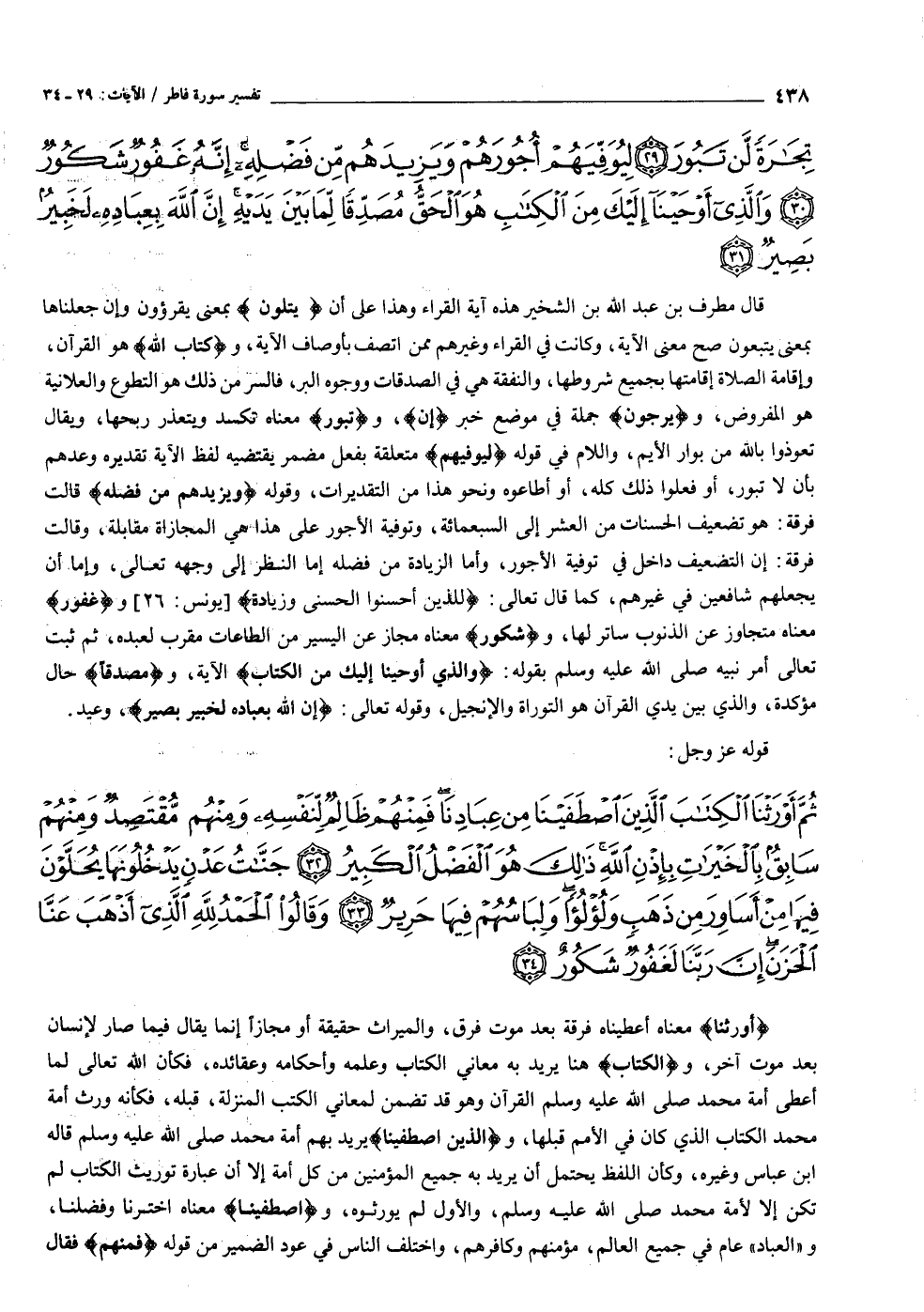 إِنَّ الَّذِينَ يَتْلُونَ كِتابَ اللَّهِ وَأَقامُوا الصَّلاةَ وَأَنْفَقُوا مِمَّا رَزَقْناهُمْ سِرًّا وَعَلانِيَةً يَرْجُونَ تِجارَةً لَنْ تَبُورَ (٢٩) لِيُوَفِّيَهُمْ أُجُورَهُمْ وَيَزِيدَهُمْ مِنْ فَضْلِهِ إِنَّهُ غَفُورٌ شَكُورٌ (٣٠) وَالَّذِي أَوْحَيْنا إِلَيْكَ مِنَ الْكِتابِ هُوَ الْحَقُّ مُصَدِّقاً لِما بَيْنَ يَدَيْهِ إِنَّ اللَّهَ بِعِبادِهِ لَخَبِيرٌ بَصِيرٌ (٣١)