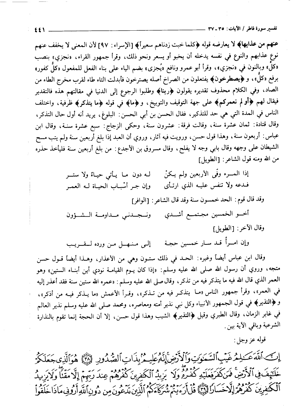 لا يعارضه قوله كُلَّما خَبَتْ زِدْناهُمْ سَعِيراً [الإسراء: ٩٧] لأن المعنى لا يخفف عنهم نوع عذابهم والنوع في نفسه يدخله أن يخبو أو يسعر ونحو ذلك، وقرأ جمهور القراء، «نجزي» بنصب «كلّ» وبالنون في «نجزي» ، وقرأ أبو عمرو ونافع «يجزى» بضم الياء على بناء الفعل للمفعول «كلّ كفور» برفع «كلّ» ، ويَصْطَرِخُونَ يفتعلون من الصراخ أصله يصترخون فأبدلت التاء طاء لقرب مخرج الطاء من الصاد، وفي الكلام محذوف تقديره يقولون رَبَّنا وطلبوا الرجوع إلى الدنيا في مقالتهم هذه فالتقدير فيقال لهم أَوَلَمْ نُعَمِّرْكُمْ على جهة التوقيف والتوبيخ، وما في قوله ما يَتَذَكَّرُ ظرفية، واختلف الناس في المدة التي هي حد للتذكير، فقال الحسن بن أبي الحسن: البلوغ، يريد أنه أول حال التذكر، وقال قتادة: ثمان عشرة سنة، وقالت فرقة: عشرون سنة، وحكى الزجاج: سبع عشرة سنة، وقال ابن عباس: أربعون سنة، وهذا قول حسن، ورويت فيه آثار، وروي أن العبد إذا بلغ أربعين سنة ولم يتب مسح الشيطان على وجهه وقال بابي وجه لا يفلح، وقال مسروق بن الأجدع: من بلغ أربعين سنة فليأخذ حذره من الله ومنه قول الشاعر: [الطويل]