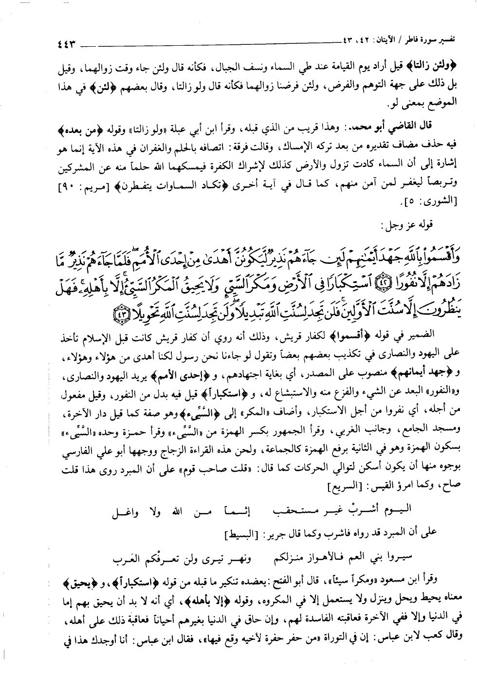 وَأَقْسَمُوا بِاللَّهِ جَهْدَ أَيْمانِهِمْ لَئِنْ جاءَهُمْ نَذِيرٌ لَيَكُونُنَّ أَهْدى مِنْ إِحْدَى الْأُمَمِ فَلَمَّا جاءَهُمْ نَذِيرٌ ما زادَهُمْ إِلاَّ نُفُوراً (٤٢) اسْتِكْباراً فِي الْأَرْضِ وَمَكْرَ السَّيِّئِ وَلا يَحِيقُ الْمَكْرُ السَّيِّئُ إِلاَّ بِأَهْلِهِ فَهَلْ يَنْظُرُونَ إِلاَّ سُنَّتَ الْأَوَّلِينَ فَلَنْ تَجِدَ لِسُنَّتِ اللَّهِ تَبْدِيلاً وَلَنْ تَجِدَ لِسُنَّتِ اللَّهِ تَحْوِيلاً (٤٣)