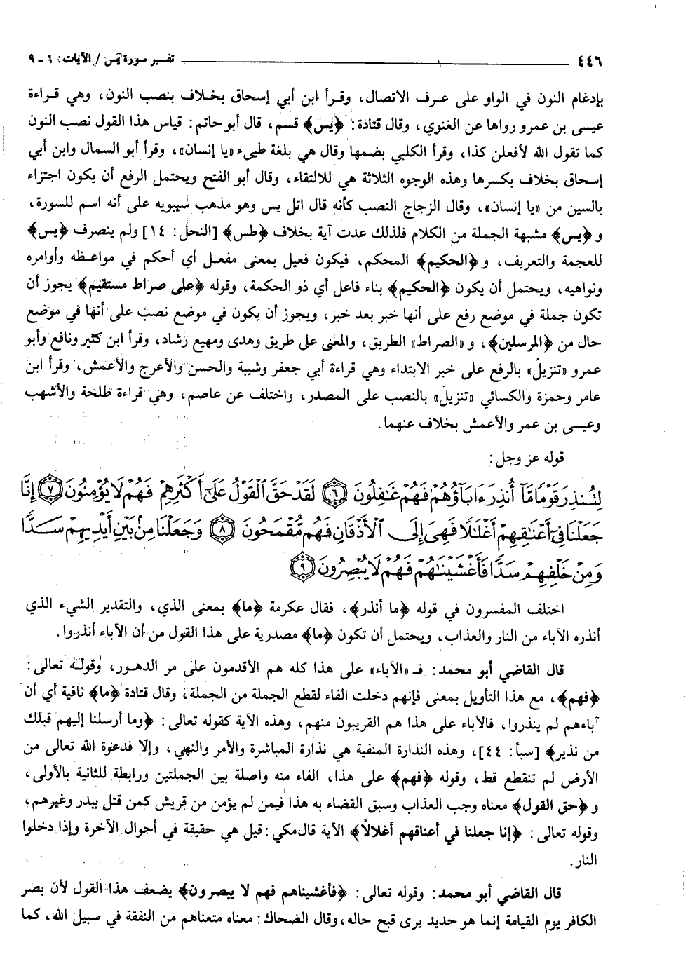 لِتُنْذِرَ قَوْماً ما أُنْذِرَ آباؤُهُمْ فَهُمْ غافِلُونَ (٦) لَقَدْ حَقَّ الْقَوْلُ عَلى أَكْثَرِهِمْ فَهُمْ لا يُؤْمِنُونَ (٧) إِنَّا جَعَلْنا فِي أَعْناقِهِمْ أَغْلالاً فَهِيَ إِلَى الْأَذْقانِ فَهُمْ مُقْمَحُونَ (٨) وَجَعَلْنا مِنْ بَيْنِ أَيْدِيهِمْ سَدًّا وَمِنْ خَلْفِهِمْ سَدًّا فَأَغْشَيْناهُمْ فَهُمْ لا يُبْصِرُونَ (٩)