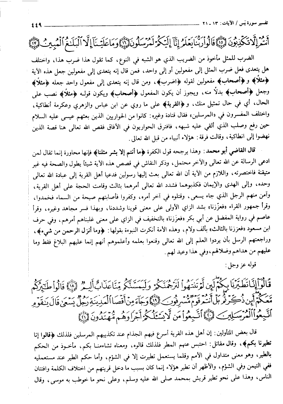قالُوا إِنَّا تَطَيَّرْنا بِكُمْ لَئِنْ لَمْ تَنْتَهُوا لَنَرْجُمَنَّكُمْ وَلَيَمَسَّنَّكُمْ مِنَّا عَذابٌ أَلِيمٌ (١٨) قالُوا طائِرُكُمْ مَعَكُمْ أَإِنْ ذُكِّرْتُمْ بَلْ أَنْتُمْ قَوْمٌ مُسْرِفُونَ (١٩) وَجاءَ مِنْ أَقْصَا الْمَدِينَةِ رَجُلٌ يَسْعى قالَ يا قَوْمِ اتَّبِعُوا الْمُرْسَلِينَ (٢٠) اتَّبِعُوا مَنْ لا يَسْئَلُكُمْ أَجْراً وَهُمْ مُهْتَدُونَ (٢١)