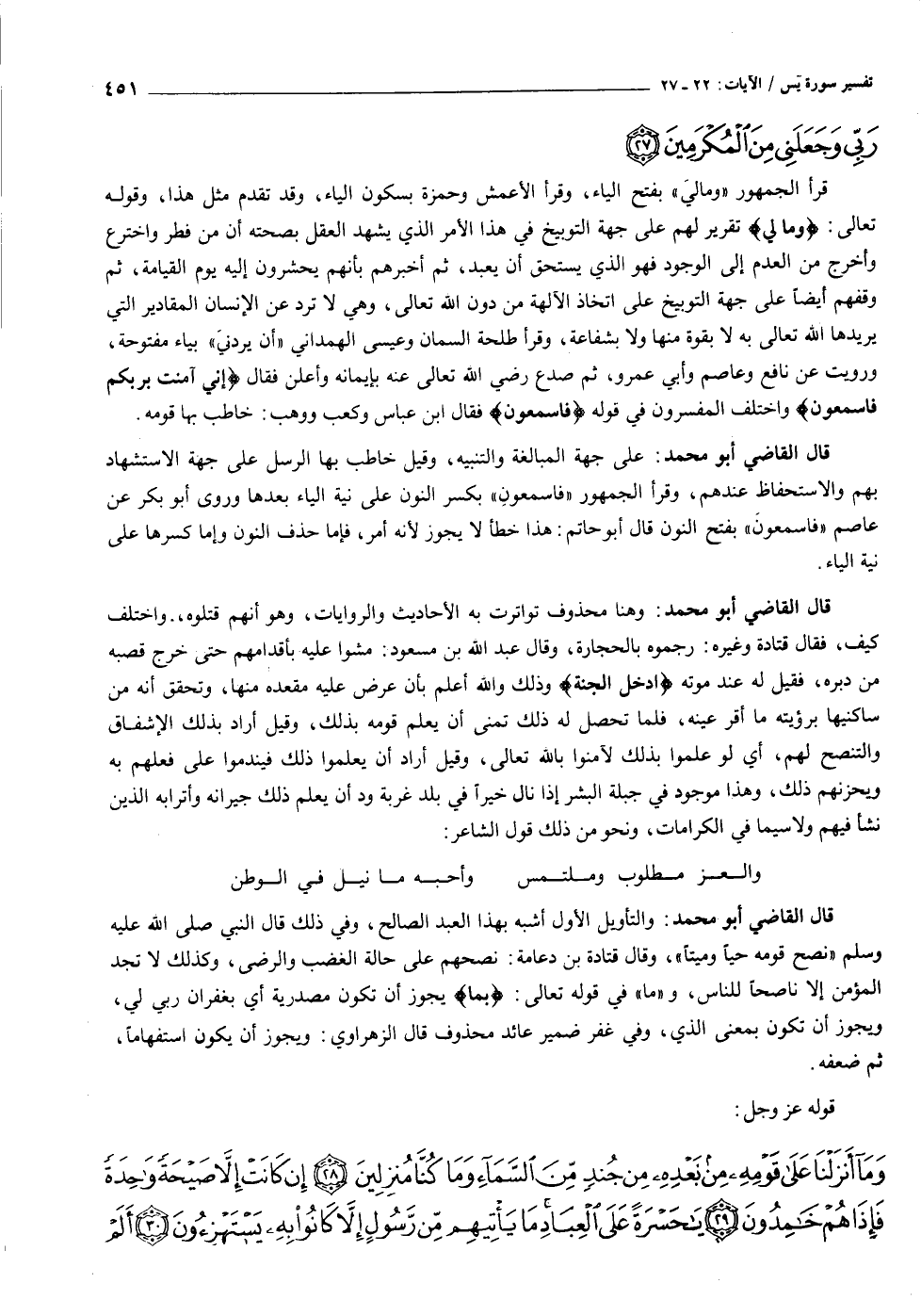 قرأ الجمهور «ومالي» بفتح الياء، وقرأ الأعمش وحمزة بسكون الياء، وقد تقدم مثل هذا، وقوله تعالى: وَما لِيَ تقرير لهم على جهة التوبيخ في هذا الأمر الذي يشهد العقل بصحته أن من فطر واخترع وأخرج من العدم إلى الوجود فهو الذي يستحق أن يعبد، ثم أخبرهم بأنهم يحشرون إليه يوم القيامة، ثم وقفهم أيضا على جهة التوبيخ على اتخاذ الآلهة من دون الله تعالى، وهي لا ترد عن الإنسان المقادير التي يريدها الله تعالى به لا بقوة منها ولا بشفاعة، وقرأ طلحة السمان وعيسى الهمداني «أن يردني» بياء مفتوحة، ورويت عن نافع وعاصم وأبي عمرو، ثم صدع رضي الله تعالى عنه بإيمانه وأعلن فقال إِنِّي آمَنْتُ بِرَبِّكُمْ فَاسْمَعُونِ واختلف المفسرون في قوله فَاسْمَعُونِ فقال ابن عباس وكعب ووهب: خاطب بها قومه.