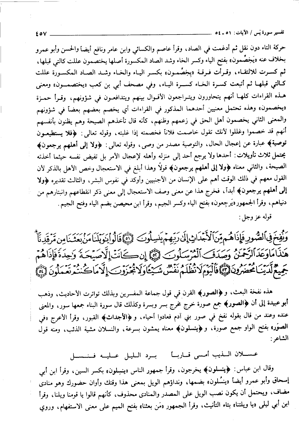حركة التاء دون نقل ثم أدغمت في الصاد، وقرأ عاصم والكسائي وابن عامر ونافع أيضا والحسن وأبو عمرو بخلاف عنه «يخصّمون» بفتح الياء وكسر الخاء وشد الصاد المكسورة أصلها يختصمون عللت كالتي قبلها، ثم كسرت للالتقاء، وقرأت فرقة «يخصّمون» بكسر الياء والخاء وشد الصاد المكسورة عللت كالتي قبلها ثم أتبعت كسرة الخاء كسرة الياء، وفي مصحف أبي بن كعب «يختصمون» ومعنى هذه القراءات كلها أنهم يتحاورون ويتراجعون الأقوال بينهم ويتدافعون في شؤونهم، وقرأ حمزة «يختصمون» وهذه تحتمل معنيين أحدهما المذكور في القراءات أي يخصم بعضهم بعضا في شؤونهم والمعنى الثاني يخصمون أهل الحق في زعمهم وظنهم، كأنه قال تأخذهم الصيحة وهم يظنون بأنفسهم أنهم قد خصموا وغللوا لأنك تقول خاصمت فلانا فخصمته إذا غلبته، وقوله تعالى: فَلا يَسْتَطِيعُونَ تَوْصِيَةً عبارة عن إعجال الحال، والتوصية مصدر من وصى، وقوله تعالى: وَلا إِلى أَهْلِهِمْ يَرْجِعُونَ يحتمل ثلاث تأويلات: أحدها ولا يرجع أحد إلى منزله وأهله لإعجال الأمر بل تفيض نفسه حيثما أخذته الصيحة، والثاني معناه وَلا إِلى أَهْلِهِمْ يَرْجِعُونَ قولا وهذا أبلغ في الاستعجال وخص الأهل بالذكر لأن القول معهم في ذلك الوقت أهم على الإنسان من الأجنبيين وأوكد في نفوس البشر، والثالث تقديره وَلا إِلى أَهْلِهِمْ يَرْجِعُونَ أبدا، فخرج هذا عن معنى وصف الاستعجال إلى معنى ذكر انقطاعهم وانبتارهم من دنياهم، وقرأ الجمهور «يرجعون» بفتح الياء وكسر الجيم، وقرأ ابن محيصن بضم الياء وفتح الجيم.