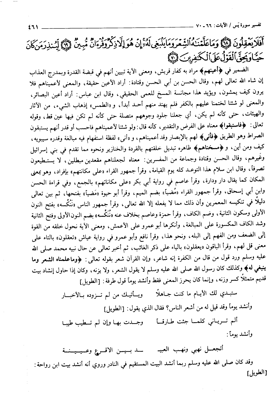الضمير في أَعْيُنِهِمْ مراد به كفار قريش، ومعنى الآية تبيين أنهم في قبضة القدرة وبمدرج العذاب إن شاء الله تعالى لهم، وقال الحسن بن أبي الحسن وقتادة: أراد الأعين حقيقة، والمعنى لأعميناهم فلا يرون كيف يمشون، ويؤيد هذا مجانسة المسخ للعمى الحقيقي، وقال ابن عباس: أراد أعين البصائر، والمعنى لو شئنا لختمنا عليهم بالكفر فلم يهتد منهم أحد أبدا، و «الطمس» إذهاب الشيء، من الآثار والهيئات، حتى كأنه لم يكن، أي جعلنا جلود وجوههم متصلة حتى كأنه لم تكن فيها عين قط، وقوله تعالى: فَاسْتَبَقُوا معناه على الفرض والتقدير، كأنه قال: ولو شئنا لأعميناهم فاحسب أو قدر أنهم يستبقون الصراط وهو الطريق فَأَنَّى لهم بالإبصار وقد أعميناهم، و «أنى» لفظة استفهام فيه مبالغة وقدره سيبويه، كيف ومن أين، و «مسخناهم» ظاهره تبديل خلقتهم بالقردة والخنازير ونحوه مما تقدم في بني إسرائيل وغيرهم، وقال الحسن وقتادة وجماعة من المفسرين: معناه لجعلناهم مقعدين مبطلين، لا يستطيعون تصرفا، وقال ابن سلام هذا التوعد كله يوم القيامة، وقرأ الجمهور القراء «على مكانتهم» بإفراد، وهو بمعنى المكان كما يقال دار ودارة، وقرأ عاصم في رواية أبي بكر «على مكاناتهم» بالجمع، وفي قراءة الحسن وابن أبي إسحاق، وقرأ جمهور القراء «مضيا» بضم الميم، وقرأ أبو حيوة «مضيا» بفتحها، ثم بين تعالى دليلا في تنكيسه المعمرين وأن ذلك مما لا يفعله إلا الله تعالى، وقرأ جمهور الناس «ننكسه» بفتح النون الأولى وسكون الثانية، وضم الكاف، وقرأ حمزة وعاصم بخلاف عنه «ننكّسه» بضم النون الأولى وفتح الثانية وشد الكاف المكسورة على المبالغة، وأنكرها أبو عمرو على الأعمش، ومعنى الآية نحول خلقه من القوة إلى الضعف ومن الفهم إلى البله، ونحو هذا، وقرأ نافع وأبو عمرو في رواية عياش «تعقلون» بالتاء على معنى قل لهم، وقرأ الباقون «يعقلون» بالياء على ذكر الغائب، ثم أخبر تعالى عن حال نبيه محمد صلى الله عليه وسلم ورد قول من قال من الكفرة إنه شاعر، وإن القرآن شعر بقوله تعالى: وَما عَلَّمْناهُ الشِّعْرَ وَما يَنْبَغِي لَهُ وكذلك كان رسول الله صلى الله عليه وسلم لا يقول الشعر، ولا يزنه، وكان إذا حاول إنشاد بيت قديم متمثلا كسر وزنه، وإنما كان يحرز المعنى فقط وأنشد يوما قول طرفة: [الطويل]