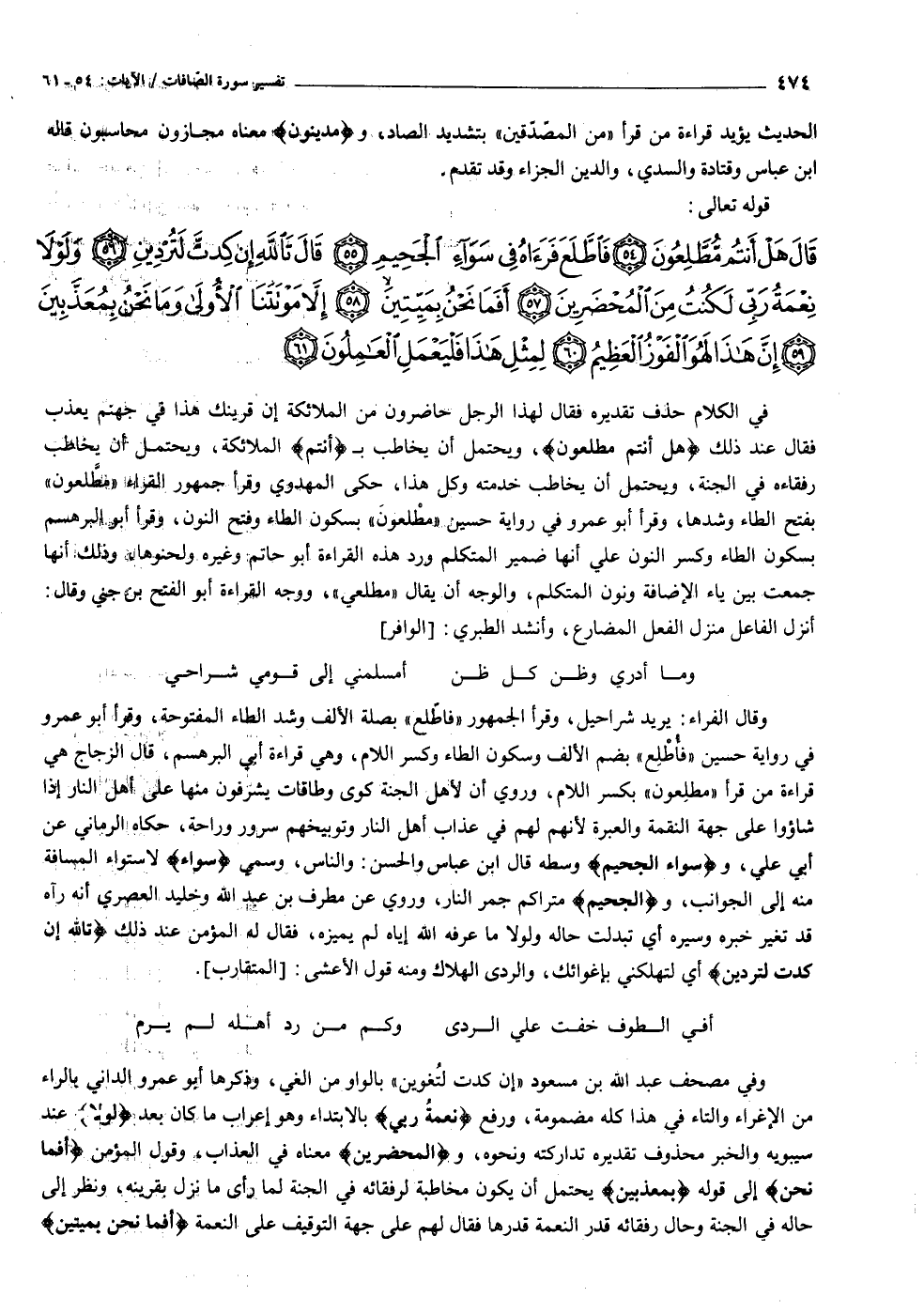 في الكلام حذف تقديره فقال لهذا الرجل حاضرون من الملائكة إن قرينك هذا في جهنم يعذب فقال عند ذلك هَلْ أَنْتُمْ مُطَّلِعُونَ، ويحتمل أن يخاطب ب أَنْتُمْ الملائكة، ويحتمل أن يخاطب رفقاءه في الجنة، ويحتمل أن يخاطب خدمته وكل هذا، حكى المهدوي وقرأ جمهور القراء «مطّلعون» بفتح الطاء وشدها، وقرأ أبو عمرو في رواية حسين «مطلعون» بسكون الطاء وفتح النون، وقرأ أبو البرهسم بسكون الطاء وكسر النون علي أنها ضمير المتكلم ورد هذه القراءة أبو حاتم وغيره ولحنوها، وذلك أنها جمعت بين ياء الإضافة ونون المتكلم، والوجه أن يقال «مطلعي» ، ووجه القراءة أبو الفتح بن جني وقال: