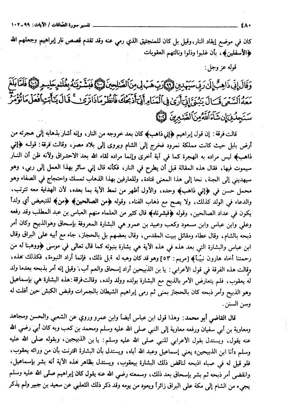 وَقالَ إِنِّي ذاهِبٌ إِلى رَبِّي سَيَهْدِينِ (٩٩) رَبِّ هَبْ لِي مِنَ الصَّالِحِينَ (١٠٠) فَبَشَّرْناهُ بِغُلامٍ حَلِيمٍ (١٠١) فَلَمَّا بَلَغَ مَعَهُ السَّعْيَ قالَ يا بُنَيَّ إِنِّي أَرى فِي الْمَنامِ أَنِّي أَذْبَحُكَ فَانْظُرْ ماذا تَرى قالَ يا أَبَتِ افْعَلْ ما تُؤْمَرُ سَتَجِدُنِي إِنْ شاءَ اللَّهُ مِنَ الصَّابِرِينَ (١٠٢)