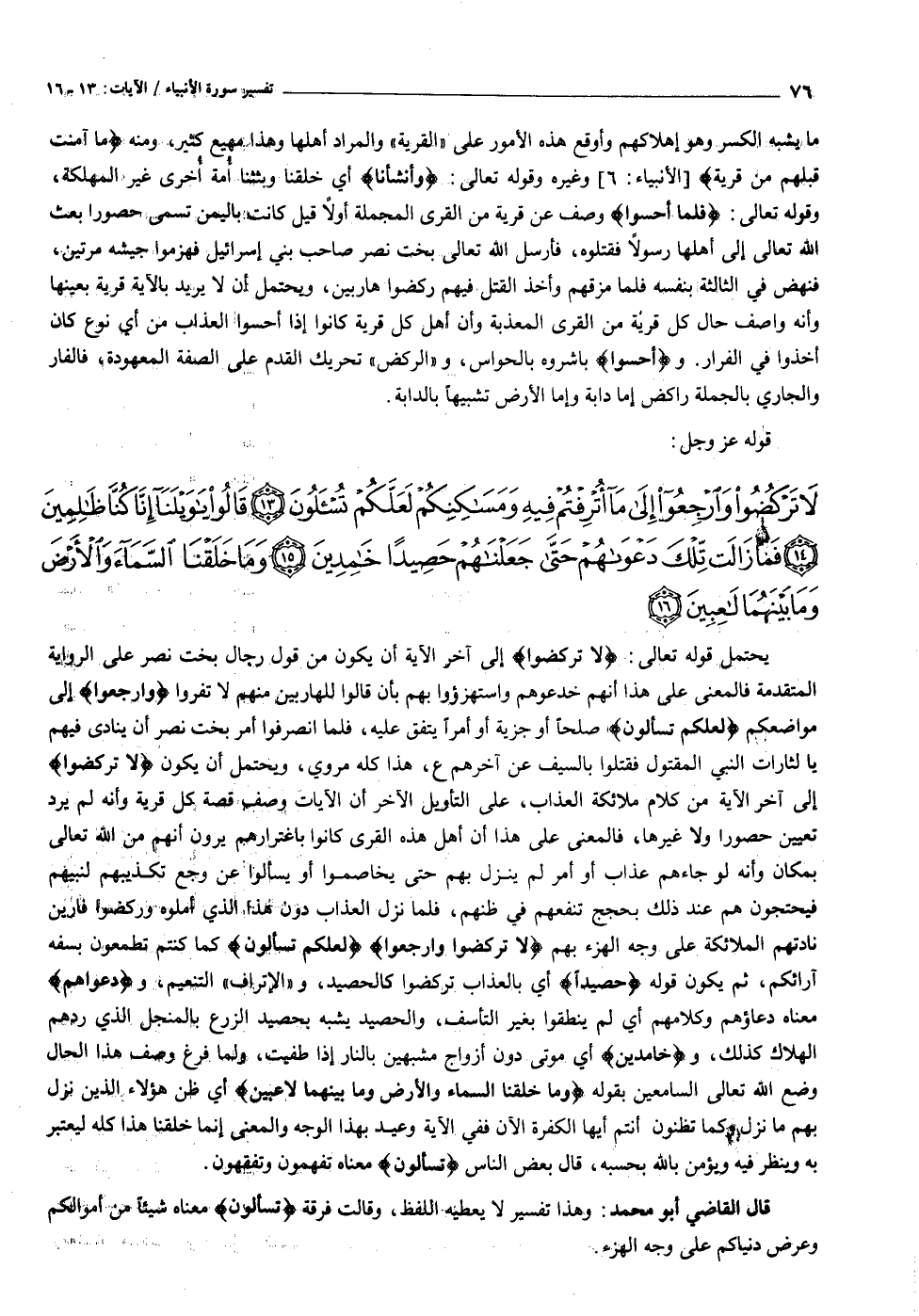 يحتمل قوله تعالى: لا تَرْكُضُوا إلى آخر الآية أن يكون من قول رجال بخت نصر على الرواية المتقدمة فالمعنى على هذا أنهم خدعوهم واستهزؤوا بهم بأن قالوا للهاربين منهم لا تفروا وَارْجِعُوا إلى مواضعكم لَعَلَّكُمْ تُسْئَلُونَ صلحا أو جزية أو أمرا يتفق عليه، فلما انصرفوا أمر بخت نصر أن ينادى فيهم يا لثارات النبي المقتول فقتلوا بالسيف عن آخرهم ع، هذا كله مروي، ويحتمل أن يكون لا تَرْكُضُوا إلى آخر الآية من كلام ملائكة العذاب، على التأويل الآخر أن الآيات وصف قصة كل قرية وأنه لم يرد تعيين حصورا ولا غيرها، فالمعنى على هذا أن أهل هذه القرى كانوا باغترارهم يرون أنهم من الله تعالى بمكان وأنه لو جاءهم عذاب أو أمر لم ينزل بهم حتى يخاصموا أو يسألوا عن وجع تكذيبهم لنبيهم فيحتجون هم عند ذلك بحجج تنفعهم في ظنهم، فلما نزل العذاب دون هذا الذي أملوه وركضوا فارين نادتهم الملائكة على وجه الهزء بهم لا تَرْكُضُوا وَارْجِعُوا لَعَلَّكُمْ تُسْئَلُونَ كما كنتم تطمعون بسفه آرائكم، ثم يكون قوله حَصِيداً أي بالعذاب تركضوا كالحصيد، و «الإتراف» التنعيم، ودَعْواهُمْ معناه دعاؤهم وكلامهم أي لم ينطقوا بغير التأسف، والحصيد يشبه بحصيد الزرع بالمنجل الذي ردهم الهلاك كذلك، وخامِدِينَ أي موتى دون أزواج مشبهين بالنار إذا طفيت، ولما فرغ وصف هذا الحال وضع الله تعالى السامعين بقوله وَما خَلَقْنَا السَّماءَ وَالْأَرْضَ وَما بَيْنَهُما لاعِبِينَ أي ظن هؤلاء الذين نزل بهم ما نزل وكما تظنون أنتم أيها الكفرة الآن ففي الآية وعيد بهذا الوجه والمعنى إنما خلقنا هذا كله ليعتبر به وينظر فيه ويؤمن بالله بحسبه، قال بعض الناس تُسْئَلُونَ معناه تفهمون وتفقهون.