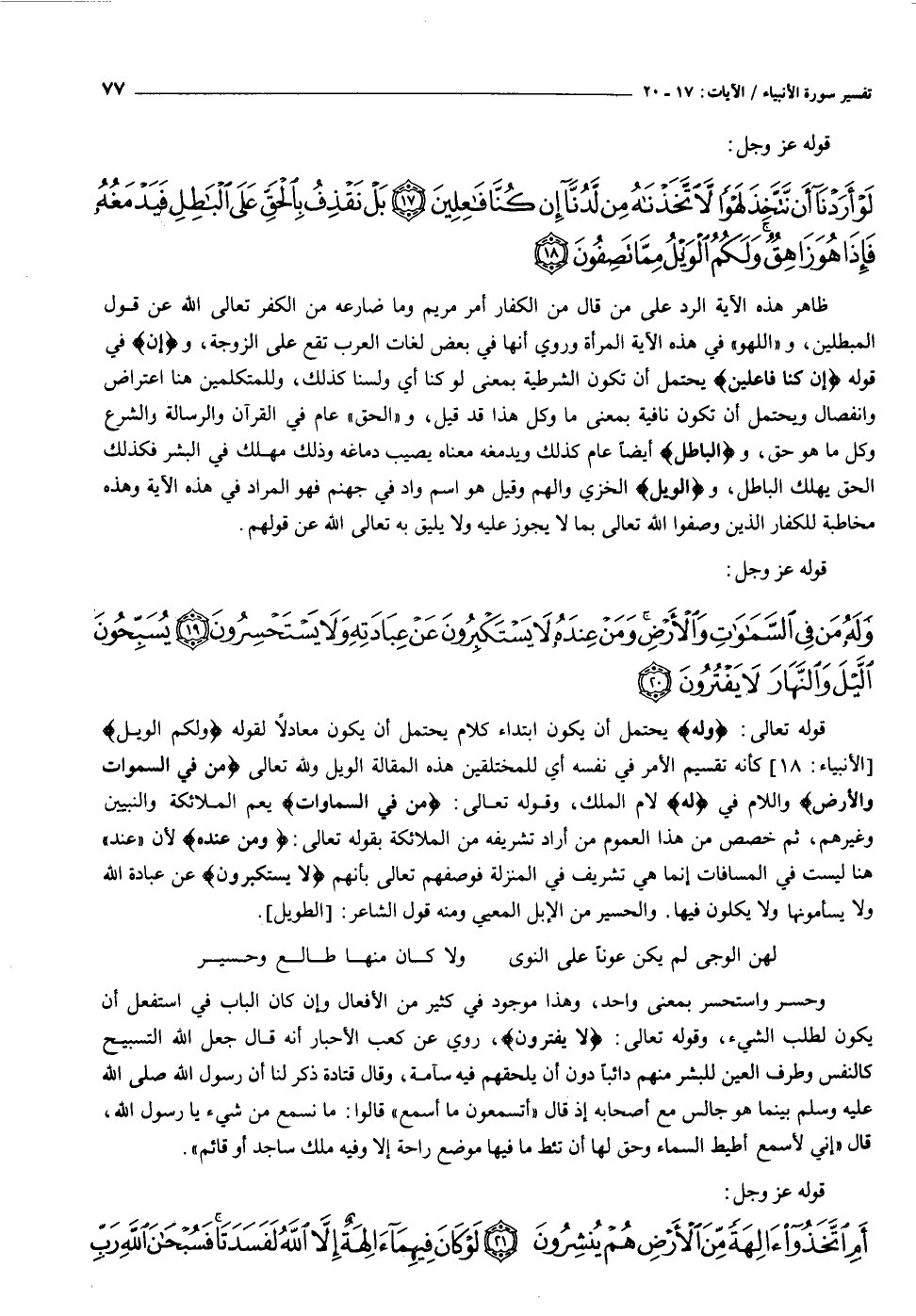 وَلَهُ مَنْ فِي السَّماواتِ وَالْأَرْضِ وَمَنْ عِنْدَهُ لا يَسْتَكْبِرُونَ عَنْ عِبادَتِهِ وَلا يَسْتَحْسِرُونَ (١٩) يُسَبِّحُونَ اللَّيْلَ وَالنَّهارَ لا يَفْتُرُونَ (٢٠)