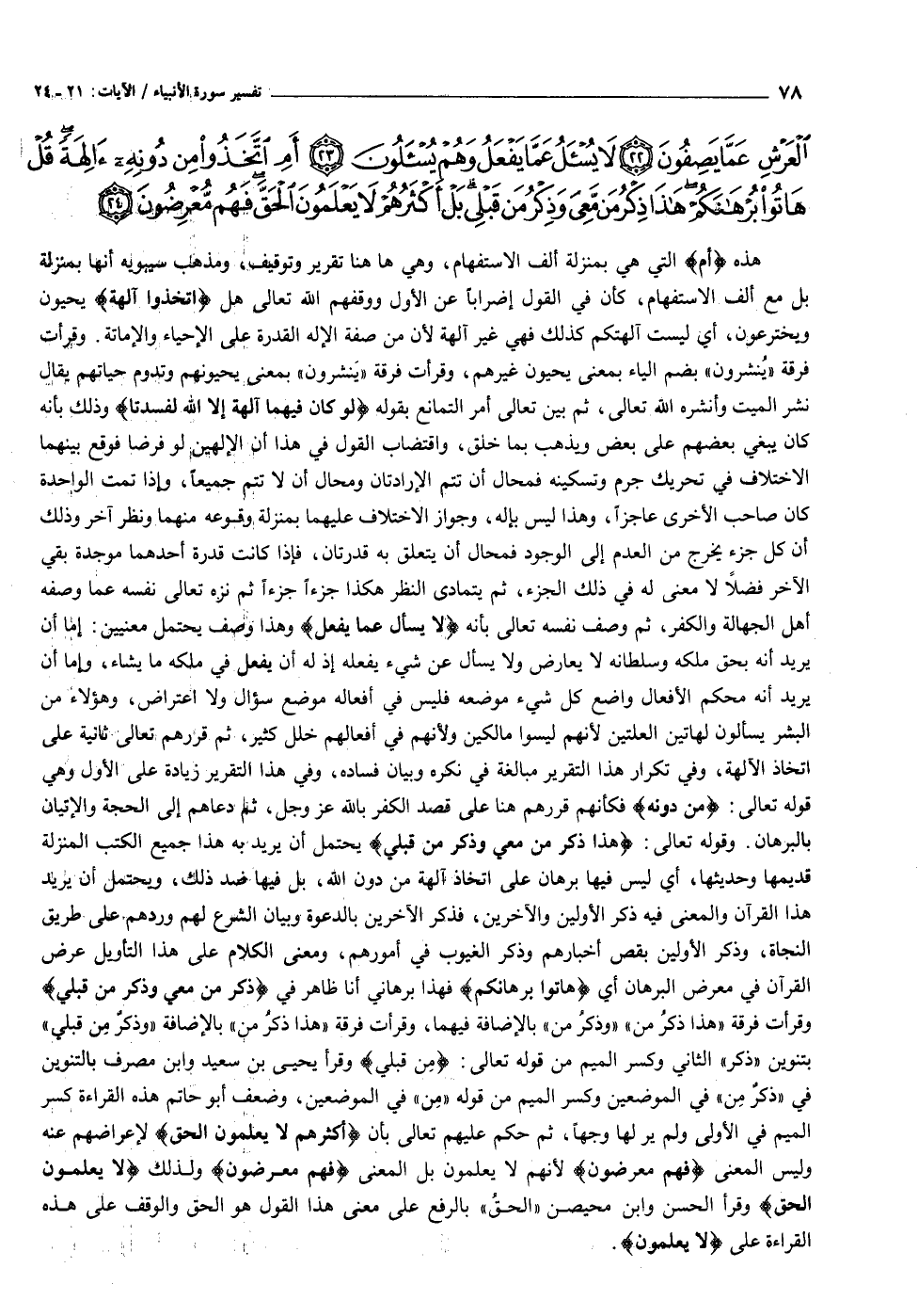 هذه أَمِ التي هي بمنزلة ألف الاستفهام، وهي هاهنا تقرير وتوقيف، ومذهب سيبويه أنها بمنزلة بل مع ألف الاستفهام، كأن في القول إضرابا عن الأول ووقفهم الله تعالى هل اتَّخَذُوا آلِهَةً يحيون ويخترعون، أي ليست آلهتكم كذلك فهي غير آلهة لأن من صفة الإله القدرة على الإحياء والإماتة. وقرأت فرقة «ينشرون» بضم الياء بمعنى يحيون غيرهم، وقرأت فرقة «ينشرون» بمعنى يحيونهم وتدوم حياتهم يقال نشر الميت وأنشره الله تعالى، ثم بين تعالى أمر التمانع بقوله لَوْ كانَ فِيهِما آلِهَةٌ إِلَّا اللَّهُ لَفَسَدَتا وذلك بأنه كان يبغي بعضهم على بعض ويذهب بما خلق، واقتضاب القول في هذا أن الإلهين لو فرضا فوقع بينهما الاختلاف في تحريك جرم وتسكينه فمحال أن تتم الإرادتان ومحال أن لا تتم جميعا، وإذا تمت الواحدة كان صاحب الأخرى عاجزا، وهذا ليس بإله، وجواز الاختلاف عليهما بمنزلة وقوعه منهما ونظر آخر وذلك أن كل جزء يخرج من العدم إلى الوجود فمحال أن يتعلق به قدرتان، فإذا كانت قدرة أحدهما موجدة بقي الآخر فضلا لا معنى له في ذلك الجزء، ثم يتمادى النظر هكذا جزءا جزءا ثم نزه تعالى نفسه عما وصفه أهل الجهالة والكفر، ثم وصف نفسه تعالى بأنه لا يُسْئَلُ عَمَّا يَفْعَلُ وهذا وصف يحتمل معنيين: إما أن يريد أنه بحق ملكه وسلطانه لا يعارض ولا يسأل عن شيء يفعله إذ له أن يفعل في ملكه ما يشاء، وإما أن يريد أنه محكم الأفعال واضع كل شيء موضعه فليس في أفعاله موضع سؤال ولا اعتراض، وهؤلاء من البشر يسألون لهاتين العلتين لأنهم ليسوا مالكين ولأنهم في أفعالهم خلل كثير، ثم قررهم تعالى ثانية على اتخاذ الآلهة، وفي تكرار هذا التقرير مبالغة في نكره وبيان فساده، وفي هذا التقرير زيادة على الأول وهي قوله تعالى: مِنْ دُونِهِ فكأنهم قررهم هنا على قصد الكفر بالله عز وجل، ثم دعاهم إلى الحجة والإتيان بالبرهان. وقوله تعالى: هذا ذِكْرُ مَنْ مَعِيَ وَذِكْرُ مَنْ قَبْلِي يحتمل أن يريد به هذا جميع الكتب المنزلة قديمها وحديثها، أي ليس فيها برهان على اتخاذ آلهة من دون الله، بل فيها ضد ذلك، ويحتمل أن يريد هذا القرآن والمعنى فيه ذكر الأولين والآخرين، فذكر الآخرين بالدعوة وبيان الشرع لهم وردهم على طريق النجاة، وذكر الأولين بقص أخبارهم وذكر الغيوب في أمورهم، ومعنى الكلام على هذا التأويل عرض القرآن في معرض البرهان أي هاتُوا بُرْهانَكُمْ فهذا برهاني أنا ظاهر في ذِكْرُ مَنْ مَعِيَ وَذِكْرُ مَنْ قَبْلِي وقرأت فرقة «هذا ذكر من» «وذكر من» بالإضافة فيهما، وقرأت فرقة «هذا ذكر من» بالإضافة «وذكر من قبلي» بتنوين «ذكر» الثاني وكسر الميم من قوله تعالى: مَنْ قَبْلِي وقرأ يحيى بن سعيد وابن مصرف بالتنوين في «ذكر من» في الموضعين وكسر الميم من قوله «من» في الموضعين، وضعف أبو حاتم هذه القراءة كسر الميم في الأولى ولم ير لها وجها، ثم حكم عليهم تعالى بأن أَكْثَرُهُمْ لا يَعْلَمُونَ الْحَقَّ لإعراضهم عنه وليس المعنى فَهُمْ مُعْرِضُونَ لأنهم لا يعلمون بل المعنى فَهُمْ مُعْرِضُونَ ولذلك لا يَعْلَمُونَ الْحَقَّ وقرأ الحسن وابن محيصن «الحق» بالرفع على معنى هذا القول هو الحق والوقف على هذه القراءة على لا يَعْلَمُونَ.