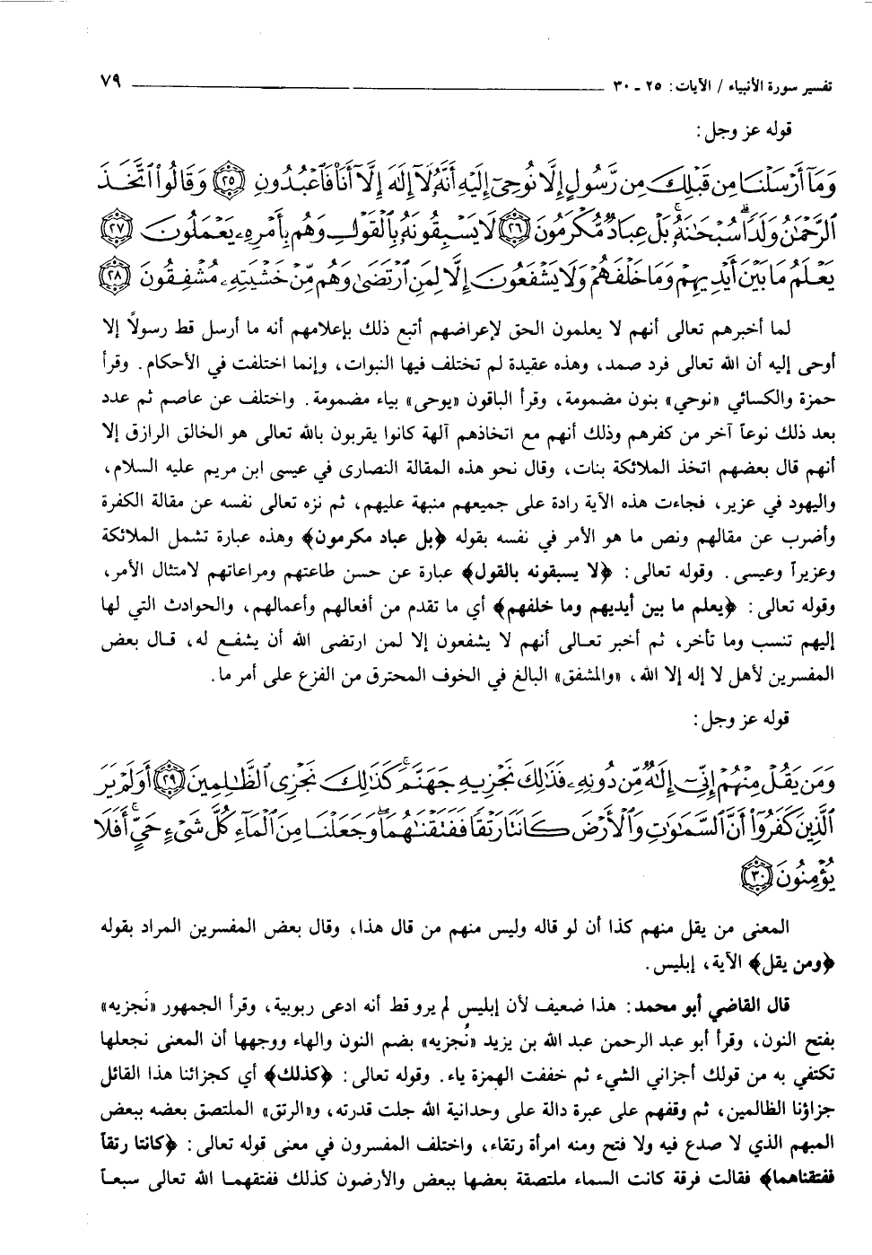 قال القاضي أبو محمد: هذا ضعيف لأن إبليس لم يرو قط أنه ادعى ربوبية، وقرأ الجمهور «نجزيه» بفتح النون، وقرأ أبو عبد الرحمن عبد الله بن يزيد «نجزيه» بضم النون والهاء ووجهها أن المعنى نجعلها تكتفي به من قولك أجزاني الشيء ثم خففت الهمزة ياء. وقوله تعالى: كَذلِكَ أي كجزائنا هذا القائل جزاؤنا الظالمين، ثم وقفهم على عبرة دالة على وحدانية الله جلت قدرته، و «الرتق» الملتصق بعضه ببعض المبهم الذي لا صدع فيه ولا فتح ومنه امرأة رتقاء، واختلف المفسرون في معنى قوله تعالى: كانَتا رَتْقاً فَفَتَقْناهُما فقالت فرقة كانت السماء ملتصقة بعضها ببعض والأرضون كذلك ففتقهما الله تعالى سبعا