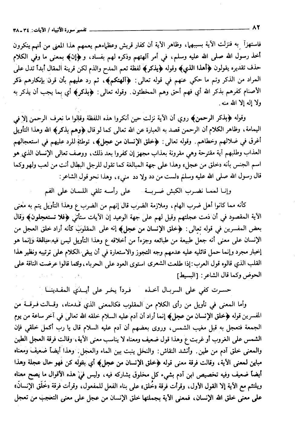 وقوله بِذِكْرِ الرَّحْمنِ روي أن الآية نزلت حين أنكروا هذه اللفظة وقالوا ما نعرف الرحمن إلا في اليمامة، وظاهر الكلام أن الرحمن قصد به العبارة عن الله تعالى كما لو قال وَهُمْ بِذِكْرِ الله وهذا التأويل أغرق في ضلالهم وخطاهم. وقوله تعالى: خُلِقَ الْإِنْسانُ مِنْ عَجَلٍ، توطئة للرد عليهم في استعجالهم العذاب وطلبهم آية مقترحة وهي مقرونة بعذاب مجهز إن كفروا بعد ذلك، ووصف تعالى الإنسان الذي هو اسم الجنس بأنه «خلق من عجل» وهذا على جهة المبالغة كما تقول للرجل البطال أنت من لعب ولهو وكما قال رسول الله صلى الله عليه وسلم «لست من دد ولا دد مني» ، وهذا نحو قول الشاعر: