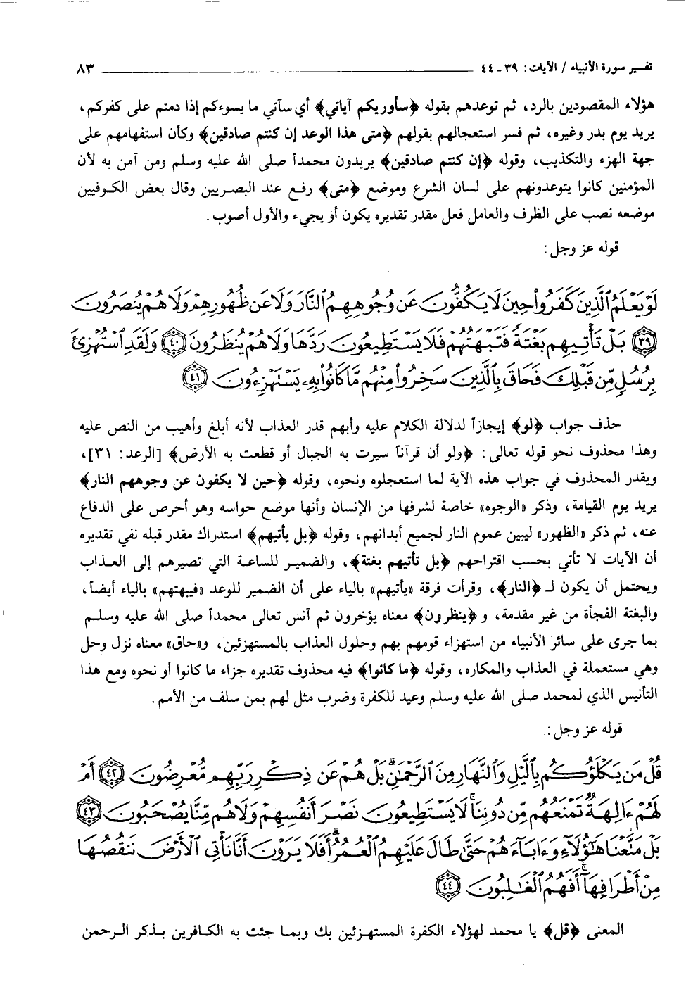 لَوْ يَعْلَمُ الَّذِينَ كَفَرُوا حِينَ لا يَكُفُّونَ عَنْ وُجُوهِهِمُ النَّارَ وَلا عَنْ ظُهُورِهِمْ وَلا هُمْ يُنْصَرُونَ (٣٩) بَلْ تَأْتِيهِمْ بَغْتَةً فَتَبْهَتُهُمْ فَلا يَسْتَطِيعُونَ رَدَّها وَلا هُمْ يُنْظَرُونَ (٤٠) وَلَقَدِ اسْتُهْزِئَ بِرُسُلٍ مِنْ قَبْلِكَ فَحاقَ بِالَّذِينَ سَخِرُوا مِنْهُمْ ما كانُوا بِهِ يَسْتَهْزِؤُنَ (٤١)