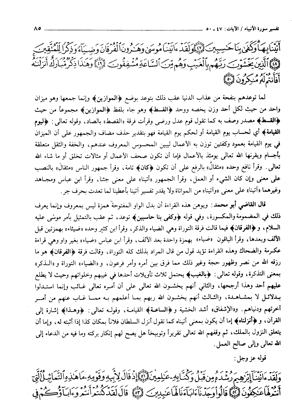 وَنَضَعُ الْمَوازِينَ الْقِسْطَ لِيَوْمِ الْقِيامَةِ فَلا تُظْلَمُ نَفْسٌ شَيْئاً وَإِنْ كانَ مِثْقالَ حَبَّةٍ مِنْ خَرْدَلٍ أَتَيْنا بِها وَكَفى بِنا حاسِبِينَ (٤٧) وَلَقَدْ آتَيْنا مُوسى وَهارُونَ الْفُرْقانَ وَضِياءً وَذِكْراً لِلْمُتَّقِينَ (٤٨) الَّذِينَ يَخْشَوْنَ رَبَّهُمْ بِالْغَيْبِ وَهُمْ مِنَ السَّاعَةِ مُشْفِقُونَ (٤٩) وَهذا ذِكْرٌ مُبارَكٌ أَنْزَلْناهُ أَفَأَنْتُمْ لَهُ مُنْكِرُونَ (٥٠)