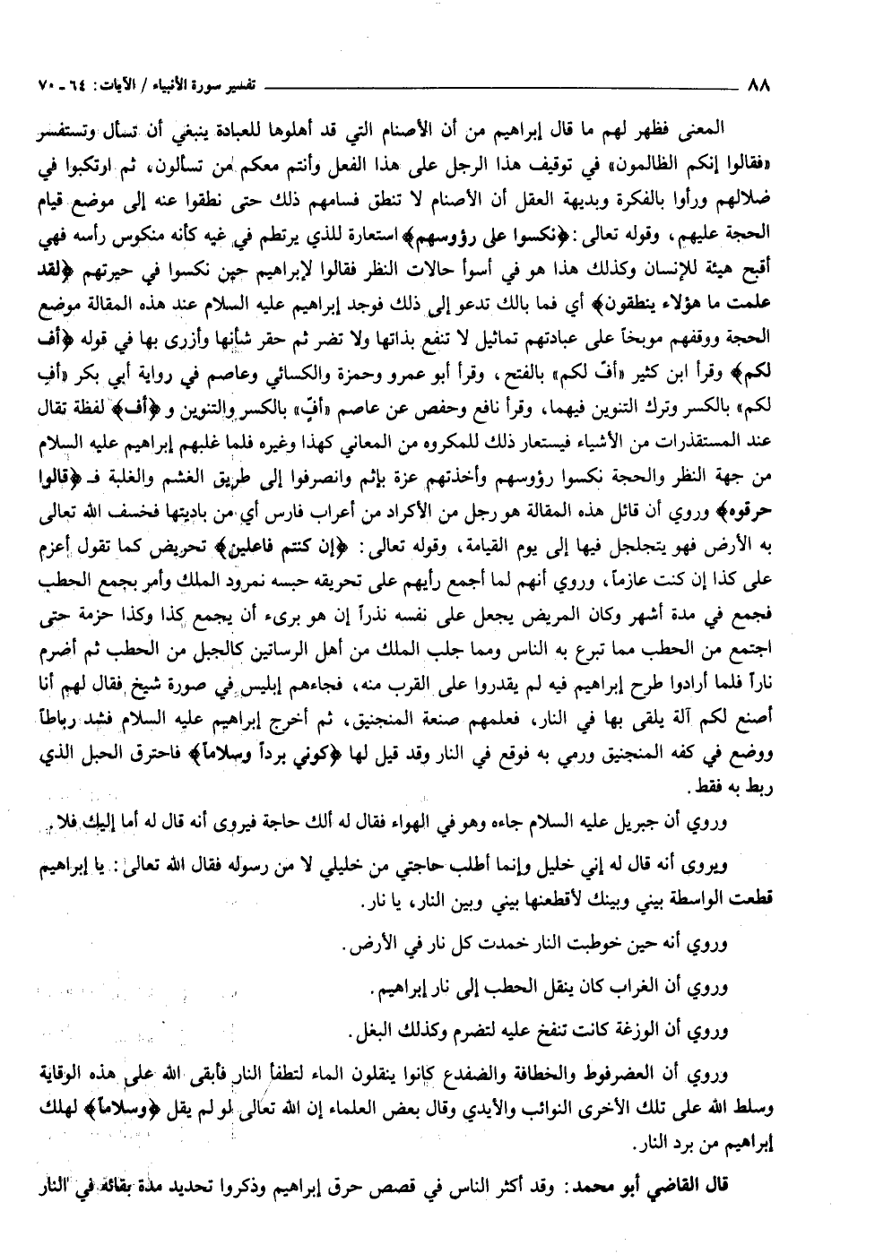 المعنى فظهر لهم ما قال إبراهيم من أن الأصنام التي قد أهلوها للعبادة ينبغي أن تسأل وتستفسر «فقالوا إنكم الظالمون» في توقيف هذا الرجل على هذا الفعل وأنتم معكم من تسألون، ثم ارتكبوا في ضلالهم ورأوا بالفكرة وبديهة العقل أن الأصنام لا تنطق فسامهم ذلك حتى نطقوا عنه إلى موضع قيام الحجة عليهم، وقوله تعالى: نُكِسُوا عَلى رُؤُسِهِمْ استعارة للذي يرتطم في غيه كأنه منكوس رأسه فهي أقبح هيئة للإنسان وكذلك هذا هو في أسوأ حالات النظر فقالوا لإبراهيم حين نكسوا في حيرتهم لَقَدْ عَلِمْتَ ما هؤُلاءِ يَنْطِقُونَ أي فما بالك تدعو إلى ذلك فوجد إبراهيم عليه السلام عند هذه المقالة موضع الحجة ووقفهم موبخا على عبادتهم تماثيل لا تنفع بذاتها ولا تضر ثم حقر شأنها وأزرى بها في قوله أُفٍّ لَكُمْ وقرأ ابن كثير «أفّ لكم» بالفتح، وقرأ أبو عمرو وحمزة والكسائي وعاصم في رواية أبي بكر «أف لكم» بالكسر وترك التنوين فيهما، وقرأ نافع وحفص عن عاصم «أفّ» بالكسر والتنوين وأُفٍّ لفظة تقال عند المستقذرات من الأشياء فيستعار ذلك للمكروه من المعاني كهذا وغيره فلما غلبهم إبراهيم عليه السلام من جهة النظر والحجة نكسوا رؤوسهم وأخذتهم عزة بإثم وانصرفوا إلى طريق الغشم والغلبة ف قالُوا حَرِّقُوهُ وروي أن قائل هذه المقالة هو رجل من الأكراد من أعراب فارس أي من باديتها فخسف الله تعالى به الأرض فهو يتجلجل فيها إلى يوم القيامة، وقوله تعالى: إِنْ كُنْتُمْ فاعِلِينَ تحريض كما تقول أعزم على كذا إن كنت عازما، وروي أنهم لما أجمع رأيهم على تحريقه حبسه نمرود الملك وأمر بجمع الحطب فجمع في مدة أشهر وكان المريض يجعل على نفسه نذرا إن هو برىء أن يجمع كذا وكذا حزمة حتى اجتمع من الحطب مما تبرع به الناس ومما جلب الملك من أهل الرساتيق كالجبل من الحطب ثم أضرم نارا فلما أرادوا طرح إبراهيم فيه لم يقدروا على القرب منه، فجاءهم إبليس في صورة شيخ فقال لهم أنا أصنع لكم آلة يلقى بها في النار، فعلمهم صنعة المنجنيق، ثم أخرج إبراهيم عليه السلام فشد رباطا ووضع في كفه المنجنيق ورمي به فوقع في النار وقد قيل لها كُونِي بَرْداً وَسَلاماً فاحترق الحبل الذي ربط به فقط.