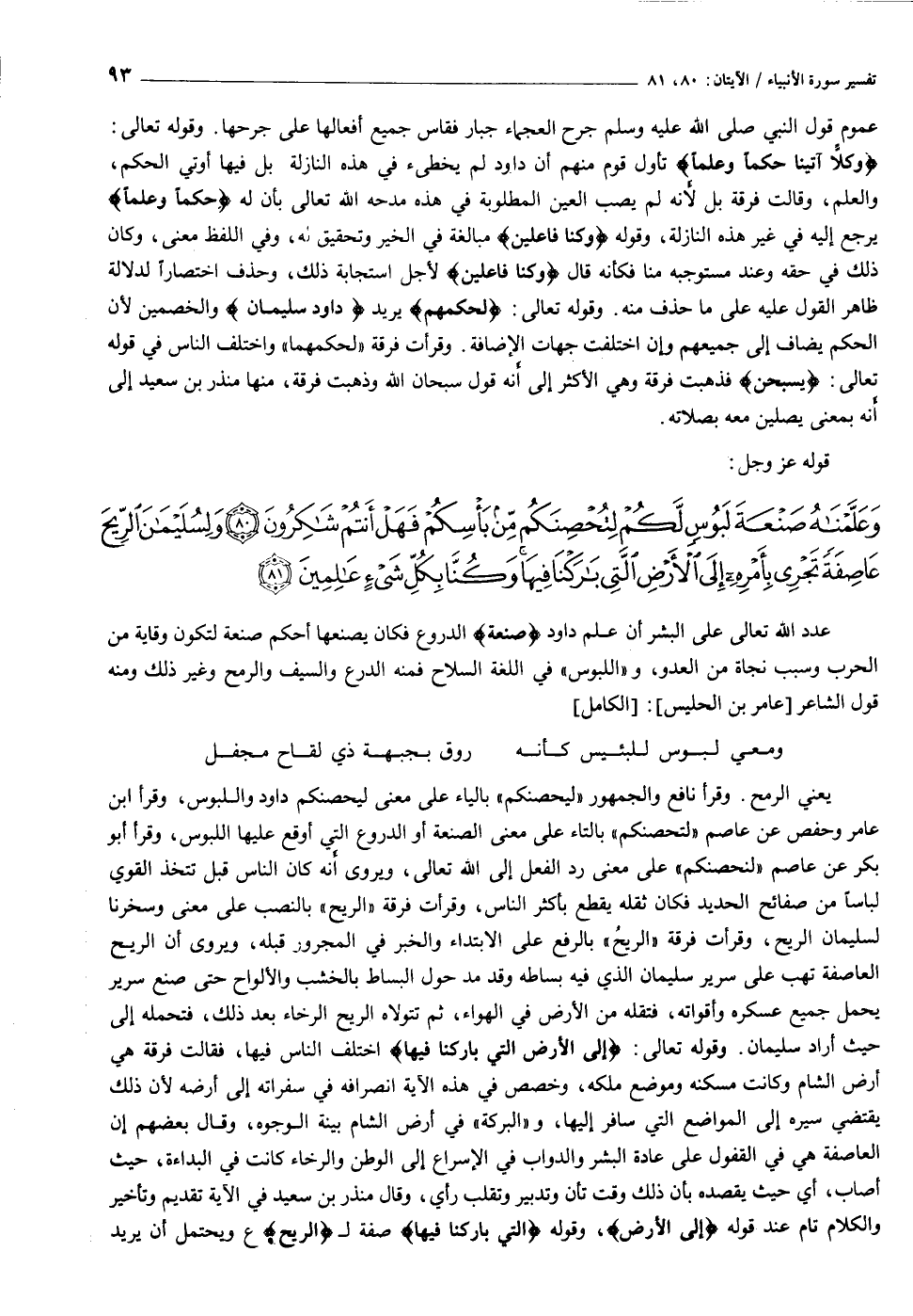 يعني الرمح. وقرأ نافع والجمهور «ليحصنكم» بالياء على معنى ليحصنكم داود واللبوس، وقرأ ابن عامر وحفص عن عاصم «لتحصنكم» بالتاء على معنى الصنعة أو الدروع التي أوقع عليها اللبوس، وقرأ أبو بكر عن عاصم «لنحصنكم» على معنى رد الفعل إلى الله تعالى، ويروى أنه كان الناس قبل تتخذ القوي لباسا من صفائح الحديد فكان ثقله يقطع بأكثر الناس، وقرأت فرقة «الريح» بالنصب على معنى وسخرنا لسليمان الريح، وقرأت فرقة «الريح» بالرفع على الابتداء والخبر في المجرور قبله، ويروى أن الريح العاصفة تهب على سرير سليمان الذي فيه بساطه وقد مد حول البساط بالخشب والألواح حتى صنع سرير يحمل جميع عسكره وأقواته، فتقله من الأرض في الهواء، ثم تتولاه الريح الرخاء بعد ذلك، فتحمله إلى حيث أراد سليمان. وقوله تعالى: إِلى الْأَرْضِ الَّتِي بارَكْنا فِيها اختلف الناس فيها، فقالت فرقة هي أرض الشام وكانت مسكنه وموضع ملكه، وخصص في هذه الآية انصرافه في سفراته إلى أرضه لأن ذلك يقتضي سيره إلى المواضع التي سافر إليها، و «البركة» في أرض الشام بينة الوجوه، وقال بعضهم إن العاصفة هي في القفول على عادة البشر والدواب في الإسراع إلى الوطن والرخاء كانت في البداءة، حيث أصاب، أي حيث يقصده بأن ذلك وقت تأن وتدبير وتقلب رأي، وقال منذر بن سعيد في الآية تقديم وتأخير والكلام تام عند قوله إِلى الْأَرْضِ، وقوله الَّتِي بارَكْنا فِيها صفة ل الرِّيحَ ع ويحتمل أن يريد