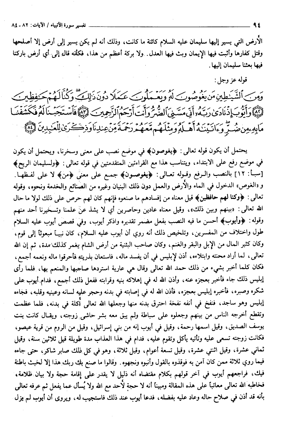 وَمِنَ الشَّياطِينِ مَنْ يَغُوصُونَ لَهُ وَيَعْمَلُونَ عَمَلاً دُونَ ذلِكَ وَكُنَّا لَهُمْ حافِظِينَ (٨٢) وَأَيُّوبَ إِذْ نادى رَبَّهُ أَنِّي مَسَّنِيَ الضُّرُّ وَأَنْتَ أَرْحَمُ الرَّاحِمِينَ (٨٣) فَاسْتَجَبْنا لَهُ فَكَشَفْنا ما بِهِ مِنْ ضُرٍّ وَآتَيْناهُ أَهْلَهُ وَمِثْلَهُمْ مَعَهُمْ رَحْمَةً مِنْ عِنْدِنا وَذِكْرى لِلْعابِدِينَ (٨٤)