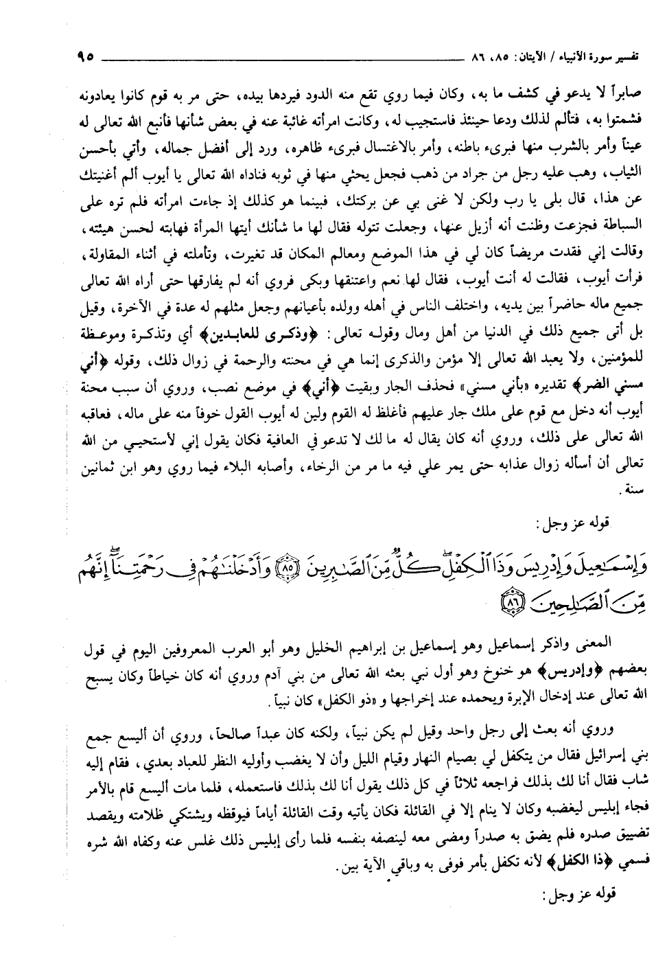 المعنى واذكر إسماعيل وهو إسماعيل بن إبراهيم الخليل وهو أبو العرب المعروفين اليوم في قول بعضهم وَإِدْرِيسَ هو خنوخ وهو أول نبي بعثه الله تعالى من بني آدم وروي أنه كان خياطا وكان يسبح الله تعالى عند إدخال الإبرة ويحمده عند إخراجها و «ذو الكفل» كان نبيا.