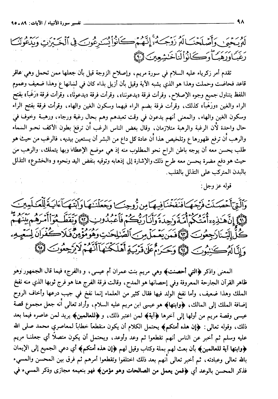 وَالَّتِي أَحْصَنَتْ فَرْجَها فَنَفَخْنا فِيها مِنْ رُوحِنا وَجَعَلْناها وَابْنَها آيَةً لِلْعالَمِينَ (٩١) إِنَّ هذِهِ أُمَّتُكُمْ أُمَّةً واحِدَةً وَأَنَا رَبُّكُمْ فَاعْبُدُونِ (٩٢) وَتَقَطَّعُوا أَمْرَهُمْ بَيْنَهُمْ كُلٌّ إِلَيْنا راجِعُونَ (٩٣) فَمَنْ يَعْمَلْ مِنَ الصَّالِحاتِ وَهُوَ مُؤْمِنٌ فَلا كُفْرانَ لِسَعْيِهِ وَإِنَّا لَهُ كاتِبُونَ (٩٤) وَحَرامٌ عَلى قَرْيَةٍ أَهْلَكْناها أَنَّهُمْ لا يَرْجِعُونَ (٩٥)