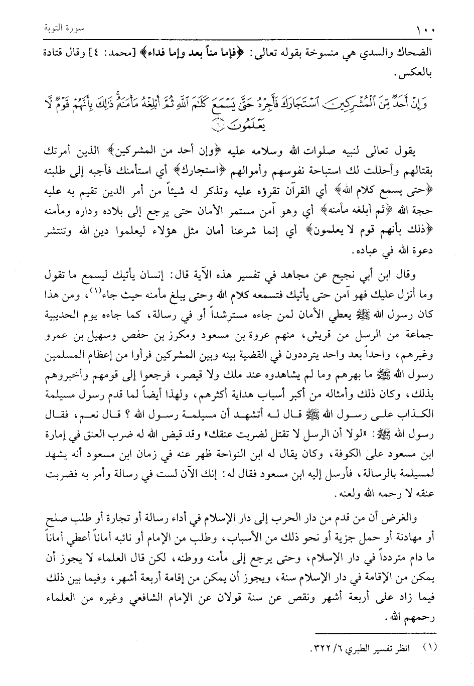 وَإِنْ أَحَدٌ مِنَ الْمُشْرِكِينَ اسْتَجارَكَ فَأَجِرْهُ حَتَّى يَسْمَعَ كَلامَ اللَّهِ ثُمَّ أَبْلِغْهُ مَأْمَنَهُ ذلِكَ بِأَنَّهُمْ قَوْمٌ لَا يَعْلَمُونَ (6)
