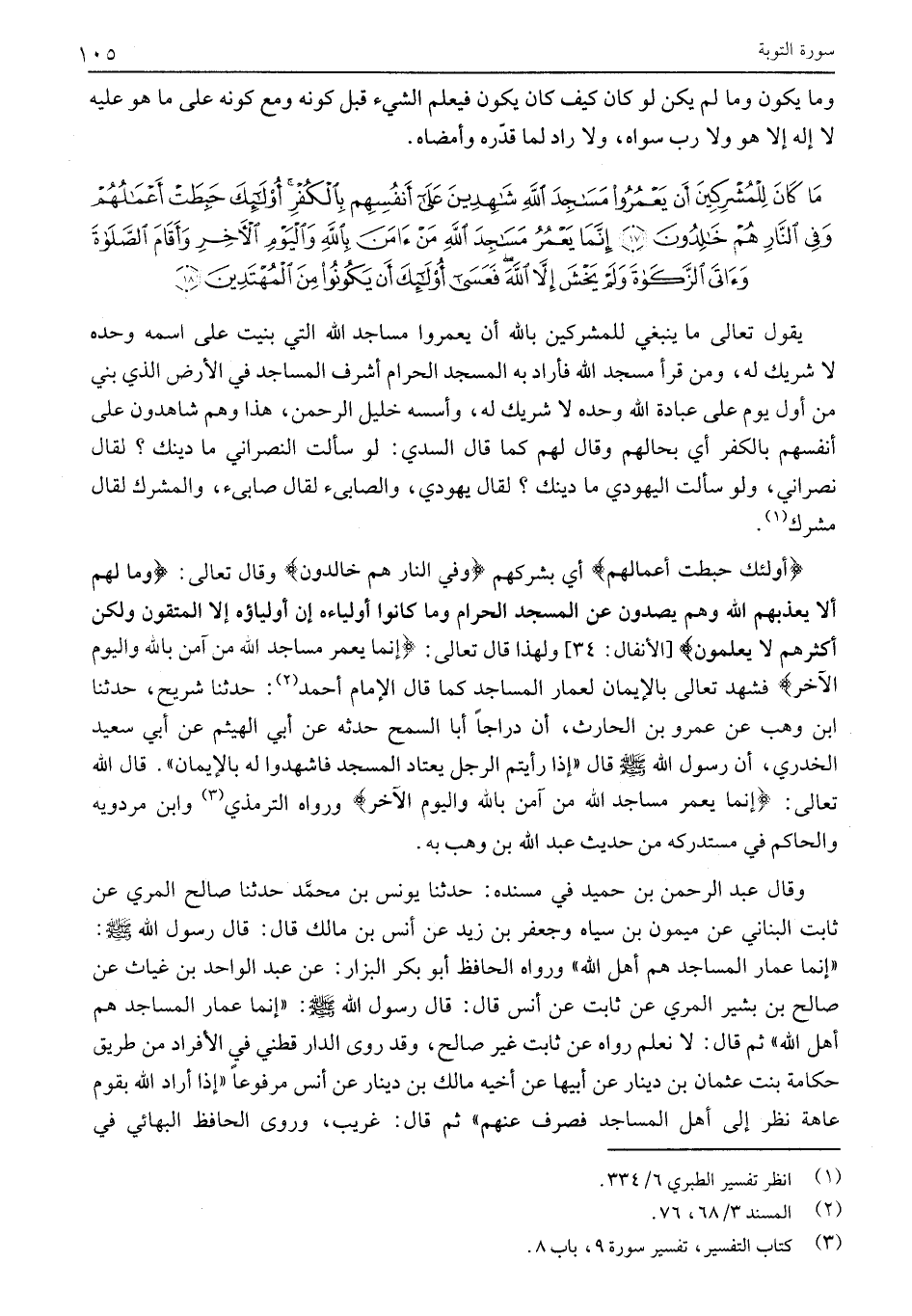 مَا كانَ لِلْمُشْرِكِينَ أَنْ يَعْمُرُوا مَساجِدَ اللَّهِ شاهِدِينَ عَلى أَنْفُسِهِمْ بِالْكُفْرِ أُولئِكَ حَبِطَتْ أَعْمالُهُمْ وَفِي النَّارِ هُمْ خالِدُونَ (17) إِنَّما يَعْمُرُ مَساجِدَ اللَّهِ مَنْ آمَنَ بِاللَّهِ وَالْيَوْمِ الْآخِرِ وَأَقامَ الصَّلاةَ وَآتَى الزَّكاةَ وَلَمْ يَخْشَ إِلاَّ اللَّهَ فَعَسى أُولئِكَ أَنْ يَكُونُوا مِنَ الْمُهْتَدِينَ (18)