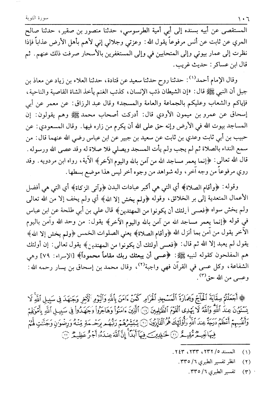 أَجَعَلْتُمْ سِقايَةَ الْحاجِّ وَعِمارَةَ الْمَسْجِدِ الْحَرامِ كَمَنْ آمَنَ بِاللَّهِ وَالْيَوْمِ الْآخِرِ وَجاهَدَ فِي سَبِيلِ اللَّهِ لا يَسْتَوُونَ عِنْدَ اللَّهِ وَاللَّهُ لا يَهْدِي الْقَوْمَ الظَّالِمِينَ (19) الَّذِينَ آمَنُوا وَهاجَرُوا وَجاهَدُوا فِي سَبِيلِ اللَّهِ بِأَمْوالِهِمْ وَأَنْفُسِهِمْ أَعْظَمُ دَرَجَةً عِنْدَ اللَّهِ وَأُولئِكَ هُمُ الْفائِزُونَ (20) يُبَشِّرُهُمْ رَبُّهُمْ بِرَحْمَةٍ مِنْهُ وَرِضْوانٍ وَجَنَّاتٍ لَهُمْ فِيها نَعِيمٌ مُقِيمٌ (21) خالِدِينَ فِيها أَبَداً إِنَّ اللَّهَ عِنْدَهُ أَجْرٌ عَظِيمٌ (22)