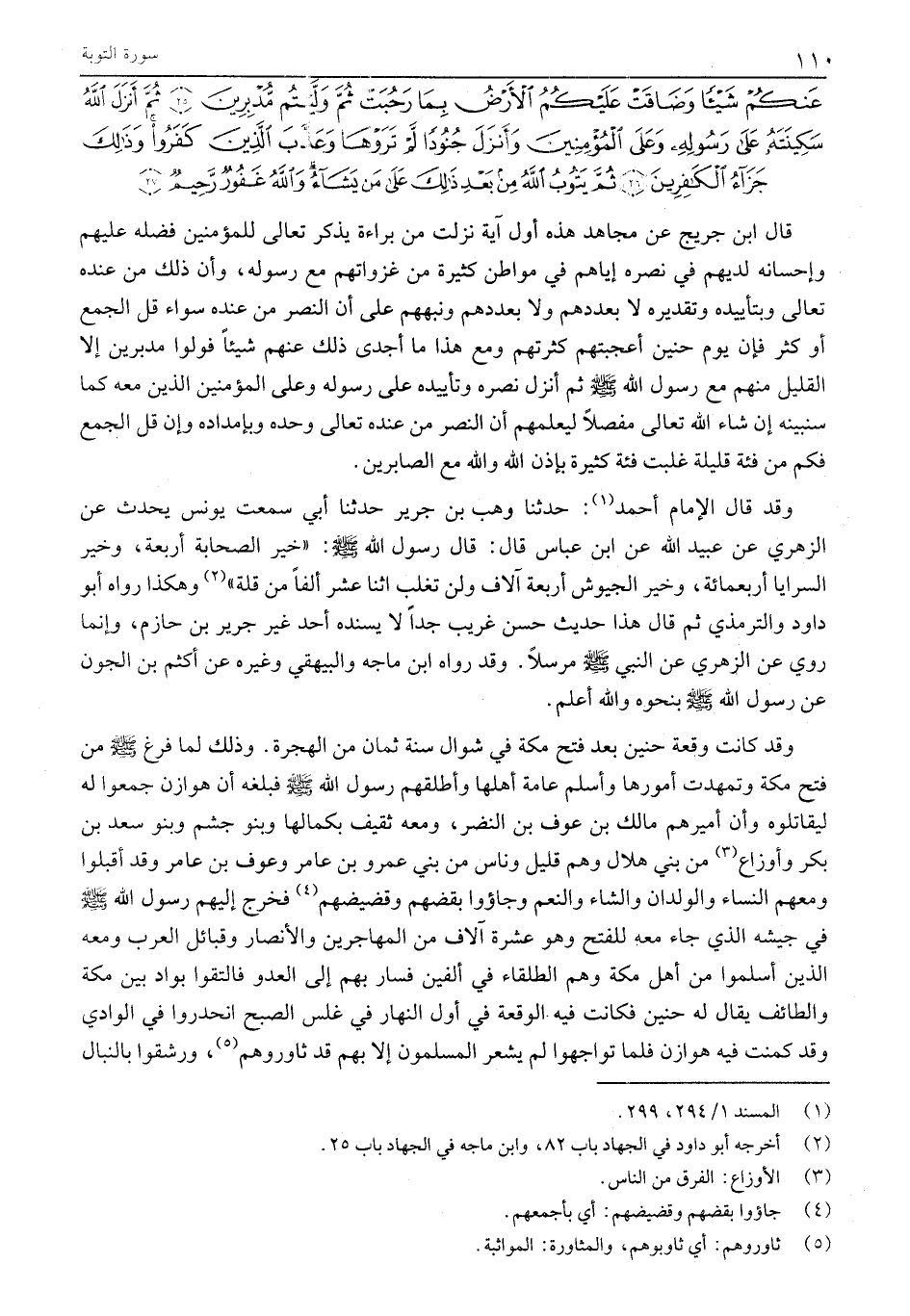 لَقَدْ نَصَرَكُمُ اللَّهُ فِي مَواطِنَ كَثِيرَةٍ وَيَوْمَ حُنَيْنٍ إِذْ أَعْجَبَتْكُمْ كَثْرَتُكُمْ فَلَمْ تُغْنِ عَنْكُمْ شَيْئاً وَضاقَتْ عَلَيْكُمُ الْأَرْضُ بِما رَحُبَتْ ثُمَّ وَلَّيْتُمْ مُدْبِرِينَ (25) ثُمَّ أَنْزَلَ اللَّهُ سَكِينَتَهُ عَلى رَسُولِهِ وَعَلَى الْمُؤْمِنِينَ وَأَنْزَلَ جُنُوداً لَمْ تَرَوْها وَعَذَّبَ الَّذِينَ كَفَرُوا وَذلِكَ جَزاءُ الْكافِرِينَ (26) ثُمَّ يَتُوبُ اللَّهُ مِنْ بَعْدِ ذلِكَ عَلى مَنْ يَشاءُ وَاللَّهُ غَفُورٌ رَحِيمٌ (27)