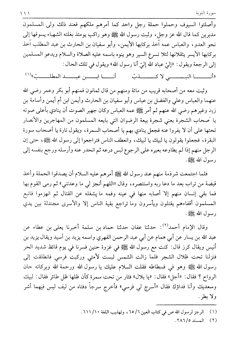 وَأَصْلَتُوا السُّيُوفَ وَحَمَلُوا حَمْلَةَ رَجُلٍ وَاحِدٍ كَمَا أَمَرَهُمْ مَلِكُهُمْ فَعِنْدَ ذَلِكَ وَلَّى الْمُسْلِمُونَ مُدْبِرِينَ كَمَا قَالَ اللَّهُ عَزَّ وَجَلَّ، وَثَبَتَ رَسُولُ اللَّهِ صَلَّى اللَّهُ عَلَيْهِ وَسَلَّمَ وَهُوَ رَاكِبٌ يومئذ بغلته الشهباء يسوقها إلى نحو الْعَدُوِّ، وَالْعَبَّاسُ عَمُّهُ آخِذٌ بِرِكَابِهَا الْأَيْمَنِ، وَأَبُو سُفْيَانَ بْنُ الْحَارِثِ بْنِ عَبْدِ الْمُطَّلِبِ آخِذٌ بِرِكَابِهَا الْأَيْسَرِ يُثْقِلَانِهَا لِئَلَّا تُسْرِعَ السَّيْرَ وَهُوَ يُنَوِّهُ بِاسْمِهِ عَلَيْهِ الصَّلَاةُ وَالسَّلَامُ وَيَدْعُو الْمُسْلِمِينَ إلى الرجعة ويقول: «إليّ عِبَادَ اللَّهِ إِلَيَّ أَنَا رَسُولُ اللَّهِ» وَيَقُولُ فِي تِلْكَ الْحَالِ: