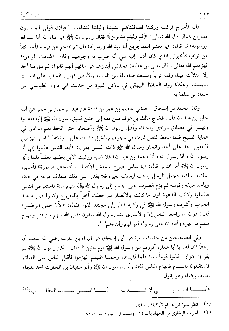 وَفِي الصَّحِيحَيْنِ مِنْ حَدِيثِ شُعْبَةَ عَنْ أَبِي إِسْحَاقَ عَنِ الْبَرَاءِ بْنِ عَازِبٍ رَضِيَ اللَّهُ عنهما أن رجلا قال له: يَا أَبَا عُمَارَةَ أَفَرَرْتُمْ عَنْ رَسُولِ اللَّهِ صَلَّى اللَّهُ عَلَيْهِ وَسَلَّمَ يَوْمَ حُنَيْنٍ؟ فَقَالَ: لَكِنَّ رَسُولَ اللَّهِ صَلَّى اللَّهُ عَلَيْهِ وَسَلَّمَ لَمْ يَفِرَّ إِنَّ هَوَازِنَ كَانُوا قَوْمًا رُمَاةً فَلَمَّا لَقِينَاهُمْ وَحَمَلْنَا عَلَيْهِمُ انْهَزَمُوا فَأَقْبَلَ النَّاسُ عَلَى الْغَنَائِمِ فَاسْتَقْبَلُونَا بِالسِّهَامِ فَانْهَزَمَ النَّاسُ فَلَقَدْ رَأَيْتُ رَسُولَ اللَّهِ صَلَّى اللَّهُ عَلَيْهِ وَسَلَّمَ وأبو سفيان بن الحارث آخذ بلجام بغلته الْبَيْضَاءِ وَهُوَ يَقُولُ: