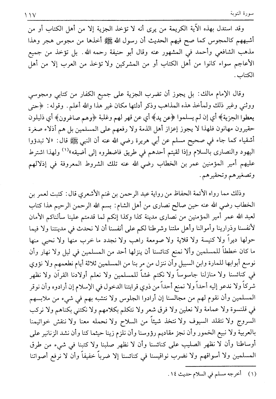 وَذَلِكَ مِمَّا رَوَاهُ الْأَئِمَّةُ الْحُفَّاظُ مِنْ رِوَايَةِ عَبْدِ الرَّحْمَنِ بْنِ غَنْمٍ الْأَشْعَرِيِّ قَالَ: كَتَبْتُ لِعُمَرَ بْنِ الْخَطَّابِ رَضِيَ اللَّهُ عَنْهُ حِينَ صَالَحَ نَصَارَى مِنْ أَهْلِ الشَّامِ: بِسْمِ اللَّهِ الرَّحْمَنِ الرَّحِيمِ هَذَا كِتَابٌ لِعَبْدِ اللَّهِ عُمَرَ أَمِيرِ الْمُؤْمِنِينَ مِنْ نَصَارَى مَدِينَةِ كَذَا وَكَذَا إِنَّكُمْ لَمَّا قَدِمْتُمْ عَلَيْنَا سَأَلْنَاكُمُ الْأَمَانَ لِأَنْفُسِنَا وَذَرَارِينَا وَأَمْوَالِنَا وَأَهْلِ مِلَّتِنَا وَشَرَطْنَا لَكُمْ على أنفسنا أن لا نُحْدِثَ فِي مَدِينَتِنَا وَلَا فِيمَا حَوْلَهَا دَيْرًا وَلَا كَنِيسَةً وَلَا قِلَايَةً وَلَا صَوْمَعَةَ رَاهِبٍ وَلَا نُجَدِّدَ مَا خَرِبَ مِنْهَا وَلَا نُحْيِيَ منها ما كان خططا للمسلمين وَأَلَّا نَمْنَعَ كَنَائِسَنَا أَنْ يَنْزِلَهَا أَحَدٌ مِنَ الْمُسْلِمِينَ فِي لَيْلٍ وَلَا نَهَارٍ وَأَنْ نُوَسِّعَ أبوابها للمارة وابن السبيل وأن ننزل مَنْ مَرَّ بِنَا مِنَ الْمُسْلِمِينَ ثَلَاثَةَ أَيَّامٍ نطعمهم ولا نؤوي فِي كَنَائِسِنَا وَلَا مَنَازِلِنَا جَاسُوسًا وَلَا نَكْتُمَ غِشًّا لِلْمُسْلِمِينَ وَلَا نُعَلِّمَ أَوْلَادَنَا الْقُرْآنَ وَلَا نُظْهِرَ شِرْكًا وَلَا نَدْعُوَ إِلَيْهِ أَحَدًا وَلَا نَمْنَعَ أَحَدًا مِنْ ذَوِي قَرَابَتِنَا الدُّخُولَ فِي الْإِسْلَامِ إِنْ أَرَادُوهُ وَأَنْ نُوَقِّرَ الْمُسْلِمِينَ وَأَنْ نَقُومَ لَهُمْ مِنْ مَجَالِسِنَا إِنْ أَرَادُوا الْجُلُوسَ وَلَا نَتَشَبَّهَ بِهِمْ فِي شَيْءٍ مِنْ مَلَابِسِهِمْ فِي قَلَنْسُوَةٍ وَلَا عِمَامَةٍ وَلَا نَعْلَيْنِ وَلَا فَرْقِ شَعْرٍ وَلَا نَتَكَلَّمَ بِكَلَامِهِمْ وَلَا نَكْتَنِيَ بِكُنَاهُمْ وَلَا نَرْكَبَ السُّرُوجَ وَلَا نَتَقَلَّدَ السُّيُوفَ وَلَا نَتَّخِذَ شَيْئًا مِنَ السِّلَاحِ وَلَا نَحْمِلَهُ مَعَنَا وَلَا نَنْقُشَ خَوَاتِيمَنَا بِالْعَرَبِيَّةِ وَلَا نَبِيعَ الخمور وأن نجز مقاديم رؤوسنا وَأَنْ نَلْزَمَ زِيَّنَا حَيْثُمَا كُنَّا وَأَنْ نَشُدَّ الزنانير على أوساطنا وأن لا نظهر الصليب على كنائسنا وأن لا نُظْهِرَ صُلُبَنَا وَلَا كُتُبَنَا فِي شَيْءٍ مِنْ طُرُقِ الْمُسْلِمِينَ وَلَا أَسْوَاقِهِمْ وَلَا نَضْرِبَ نَوَاقِيسَنَا في كنائسنا إلا ضربا خفيفا وأن لا نرفع أصواتنا
