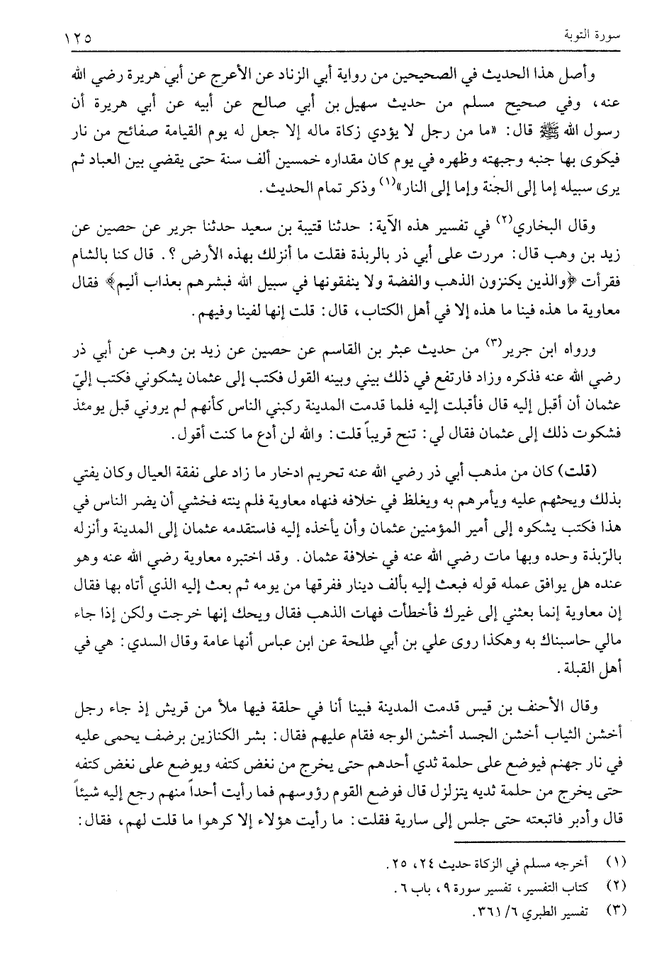 وَقَالَ الْبُخَارِيُّ «2» فِي تَفْسِيرِ هَذِهِ الْآيَةِ: حَدَّثَنَا قُتَيْبَةُ بْنُ سَعِيدٍ حَدَّثَنَا جَرِيرٌ عَنْ حُصَيْنٍ عَنْ زَيْدِ بْنِ وَهْبٍ قَالَ: مَرَرْتُ عَلَى أَبِي ذَرٍّ بالرَّبَذَةِ فَقُلْتُ مَا أَنْزَلَكَ بِهَذِهِ الْأَرْضِ؟. قَالَ كُنَّا بِالشَّامِ فَقَرَأْتُ وَالَّذِينَ يَكْنِزُونَ الذَّهَبَ وَالْفِضَّةَ وَلا يُنْفِقُونَها فِي سَبِيلِ اللَّهِ فَبَشِّرْهُمْ بِعَذابٍ أَلِيمٍ فَقَالَ مُعَاوِيَةُ مَا هَذِهِ فِينَا مَا هَذِهِ إِلَّا فِي أَهْلِ الْكِتَابِ، قَالَ: قُلْتُ إِنَّهَا لَفِينَا وَفِيهِمْ.