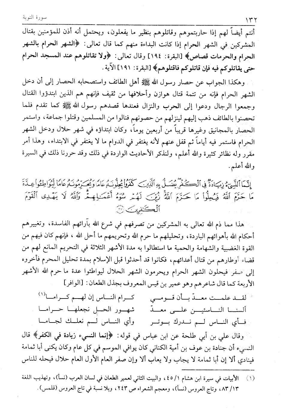 هَذَا مِمَّا ذَمَّ اللَّهُ تَعَالَى بِهِ الْمُشْرِكِينَ مِنْ تَصَرُّفِهِمْ فِي شَرْعِ اللَّهِ بِآرَائِهِمُ الْفَاسِدَةِ، وَتَغْيِيرِهِمْ أَحْكَامَ اللَّهِ بِأَهْوَائِهِمُ الْبَارِدَةِ، وَتَحْلِيلِهِمْ مَا حَرَّمَ اللَّهُ وَتَحْرِيمِهِمْ مَا أَحَلَّ اللَّهُ، فَإِنَّهُمْ كَانَ فِيهِمْ مِنَ الْقُوَّةِ الْغَضَبِيَّةِ وَالشَّهَامَةِ وَالْحَمِيَّةِ مَا اسْتَطَالُوا بِهِ مُدَّةَ الْأَشْهُرِ الثَّلَاثَةِ فِي التَّحْرِيمِ الْمَانِعِ لَهُمْ مِنْ قضاء أو طارهم مِنْ قِتَالِ أَعْدَائِهِمْ، فَكَانُوا قَدْ أَحْدَثُوا قَبْلَ الإسلام بمدة تحليل المحرم فأخروه إِلَى صَفَرٍ فَيُحِلُّونَ الشَّهْرَ الْحَرَامَ وَيُحَرِّمُونَ الشَّهْرَ الحلال ليواطئوا عدة ما حرم الله الْأَشْهُرِ الْأَرْبَعَةِ كَمَا قَالَ شَاعِرُهُمْ وَهُوَ عُمَيْرُ بن قيس المعروف بجذل الطعان: [الوافر]