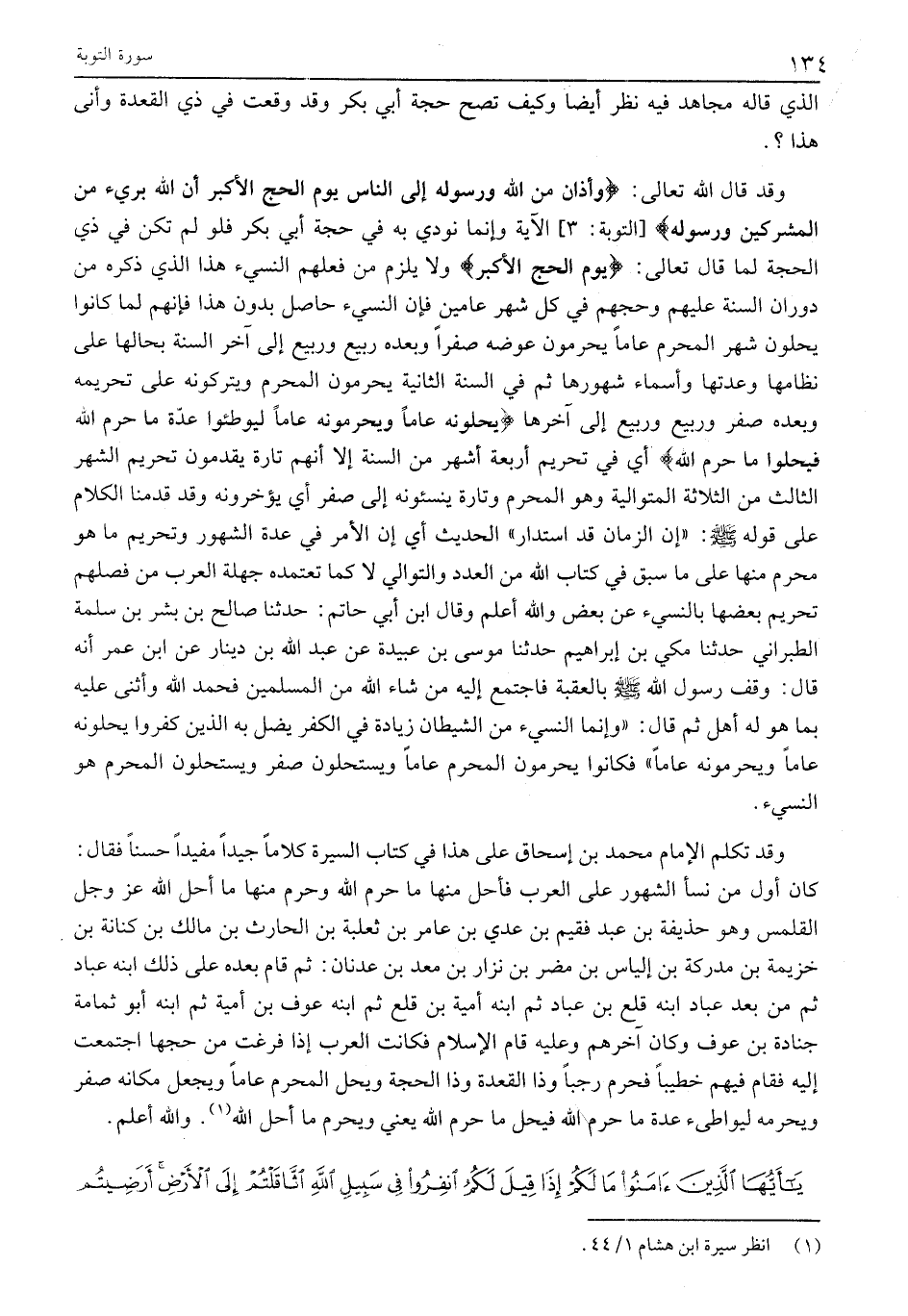وَقَدْ قَالَ اللَّهُ تَعَالَى: وَأَذانٌ مِنَ اللَّهِ وَرَسُولِهِ إِلَى النَّاسِ يَوْمَ الْحَجِّ الْأَكْبَرِ أَنَّ اللَّهَ بَرِيءٌ مِنَ الْمُشْرِكِينَ وَرَسُولُهُ [التوبة: 3] الآية وإنما نودي به فِي حَجَّةِ أَبِي بَكْرٍ فَلَوْ لَمْ تَكُنْ فِي ذِي الْحِجَّةِ لَمَا قَالَ تَعَالَى: يَوْمَ الْحَجِّ الْأَكْبَرِ وَلَا يَلْزَمُ مِنْ فِعْلِهِمُ النَّسِيءَ هَذَا الَّذِي ذَكَرَهُ مِنْ دَوَرَانِ السَّنَةِ عَلَيْهِمْ وَحَجِّهِمْ فِي كُلِّ شَهْرٍ عَامَيْنِ فَإِنَّ النَّسِيءَ حَاصِلٌ بِدُونِ هَذَا فَإِنَّهُمْ لَمَّا كَانُوا يُحِلُّونَ شهر المحرم عاما يحرمون عوضه صفرا وبعده ربيع وربيع إلى آخر السنة بِحَالِهَا عَلَى نِظَامِهَا وَعِدَّتِهَا وَأَسْمَاءِ شُهُورِهَا ثُمَّ في السنة الثانية يُحَرِّمُونَ الْمُحَرَّمَ وَيَتْرُكُونَهُ عَلَى تَحْرِيمِهِ وَبَعْدَهُ صَفَرٌ وربيع وربيع إلى آخرها يُحِلُّونَهُ عاماً وَيُحَرِّمُونَهُ عاماً لِيُواطِؤُا عِدَّةَ مَا حَرَّمَ اللَّهُ فَيُحِلُّوا مَا حَرَّمَ اللَّهُ أَيْ فِي تَحْرِيمِ أَرْبَعَةِ أَشْهُرٍ مِنَ السَّنَةِ إِلَّا أَنَّهُمْ تَارَةً يُقَدِّمُونَ تَحْرِيمَ الشَّهْرِ الثَّالِثِ مِنَ الثَّلَاثَةِ الْمُتَوَالِيَةِ وَهُوَ الْمُحَرَّمُ وَتَارَةً يَنْسَئُونَهُ إِلَى صَفَرٍ أَيْ يُؤَخِّرُونَهُ وَقَدْ قَدَّمَنَا الْكَلَامَ عَلَى قَوْلِهِ صَلَّى اللَّهُ عَلَيْهِ وَسَلَّمَ: «إن الزمان قد استدار» الحديث أَيْ أَنَّ الْأَمْرَ فِي عِدَّةِ الشُّهُورِ وَتَحْرِيمِ مَا هُوَ مُحَرَّمٌ مِنْهَا عَلَى مَا سَبَقَ فِي كِتَابِ اللَّهِ مِنَ الْعَدَدِ وَالتَّوَالِي لَا كما تعتمده جَهَلَةُ الْعَرَبِ مِنْ فَصْلِهِمْ تَحْرِيمَ بَعْضِهَا بِالنَّسِيءِ عَنْ بَعْضٍ وَاللَّهُ أَعْلَمُ وَقَالَ ابْنُ أَبِي حَاتِمٍ: حَدَّثَنَا صَالِحُ بْنُ بِشْرِ بْنِ سَلَمَةَ الطَّبَرَانِيُّ حَدَّثَنَا مَكِّيُّ بْنُ إِبْرَاهِيمَ حَدَّثَنَا مُوسَى بْنُ عُبَيْدَةَ عَنْ عَبْدِ اللَّهِ بْنِ دِينَارٍ عَنِ ابْنِ عُمَرَ أَنَّهُ قَالَ: وَقَفَ رَسُولُ اللَّهِ صَلَّى اللَّهُ عَلَيْهِ وَسَلَّمَ بِالْعَقَبَةِ فَاجْتَمَعَ إِلَيْهِ مَنْ شَاءَ اللَّهُ مِنَ الْمُسْلِمِينَ فَحَمِدَ اللَّهَ وَأَثْنَى عَلَيْهِ بِمَا هُوَ لَهُ أَهْلٌ ثُمَّ قَالَ: «وَإِنَّمَا النَّسِيءُ مِنَ الشَّيْطَانِ زِيَادَةٌ فِي الْكُفْرِ يُضَلُّ بِهِ الَّذِينَ كَفَرُوا يُحِلُّونَهُ عَامًا وَيُحَرِّمُونَهُ عَامًا» فَكَانُوا يُحَرِّمُونَ الْمُحَرَّمَ عَامًا ويستحلون صفر ويستحلون المحرم هو النَّسِيءُ.