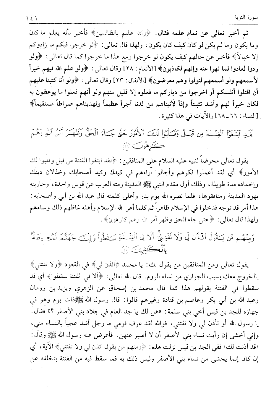 يَقُولُ تَعَالَى وَمِنَ الْمُنَافِقِينَ مَنْ يَقُولُ لَكَ: يَا مُحَمَّدُ ائْذَنْ لِي فِي الْقُعُودِ وَلا تَفْتِنِّي بِالْخُرُوجِ مَعَكَ بِسَبَبِ الْجَوَارِي مِنْ نِسَاءِ الرُّومِ. قَالَ اللَّهُ تَعَالَى: أَلا فِي الْفِتْنَةِ سَقَطُوا أَيْ قَدْ سَقَطُوا فِي الْفِتْنَةِ بِقَوْلِهِمْ هَذَا كَمَا قَالَ مُحَمَّدُ بْنُ إِسْحَاقَ عَنِ الزُّهْرِيِّ وَيَزِيدَ بْنِ رُومَانَ وَعَبْدِ اللَّهِ بْنُ أَبِي بَكْرٍ وَعَاصِمُ بْنِ قَتَادَةَ وَغَيْرِهِمْ قَالُوا: قَالَ رَسُولُ اللَّهِ صَلَّى اللَّهُ عَلَيْهِ وَسَلَّمَ ذَاتَ يَوْمٍ وَهُوَ فِي جَهَازِهِ لِلْجَدِّ بْنِ قَيْسٍ أَخِي بَنِي سَلَمَةَ: «هَلْ لَكَ يَا جَدُّ الْعَامَ فِي جِلَادِ بَنِي الْأَصْفَرِ؟» فَقَالَ: