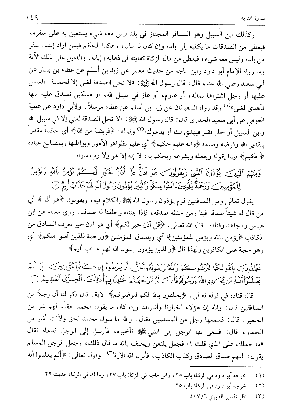 وَكَذَلِكَ ابْنُ السَّبِيلِ وَهُوَ الْمُسَافِرُ الْمُجْتَازُ فِي بَلَدٍ لَيْسَ مَعَهُ شَيْءٌ يَسْتَعِينُ بِهِ عَلَى سَفَرِهِ، فَيُعْطَى مِنَ الصَّدَقَاتِ مَا يَكْفِيهِ إِلَى بَلَدِهِ وَإِنْ كَانَ لَهُ مَالٌ، وَهَكَذَا الْحُكْمُ فِيمَنْ أَرَادَ إِنْشَاءَ سَفَرٍ مِنْ بَلَدِهِ وَلَيْسَ مَعَهُ شَيْءٌ، فَيُعْطَى مِنْ مَالِ الزَّكَاةِ كِفَايَتَهُ فِي ذَهَابِهِ وَإِيَابِهِ. وَالدَّلِيلُ عَلَى ذَلِكَ الْآيَةُ وَمَا رَوَاهُ الْإِمَامُ أَبُو دَاوُدَ وَابْنُ مَاجَهْ مِنْ حَدِيثِ مَعْمَرٍ عَنْ زَيْدِ بْنِ أَسْلَمَ عَنْ عَطَاءِ بْنِ يَسَارٍ عَنْ أَبِي سَعِيدٍ رَضِيَ اللَّهُ عَنْهُ، قَالَ: قَالَ رَسُولُ اللَّهِ صَلَّى اللَّهُ عَلَيْهِ وَسَلَّمَ: «لَا تَحِلُّ الصَّدَقَةُ لِغَنِيٍّ إِلَّا لِخَمْسَةٍ: الْعَامِلِ عَلَيْهَا أَوْ رَجُلٍ اشْتَرَاهَا بِمَالِهِ، أَوْ غَارِمٍ، أَوْ غَازٍ فِي سَبِيلِ اللَّهِ، أَوْ مِسْكِينٍ تُصُدِّقَ عَلَيْهِ مِنْهَا فَأَهْدَى لِغَنِيٍّ» «1» وَقَدْ رَوَاهُ السُّفْيَانَانِ عَنْ زَيْدِ بْنِ أَسْلَمَ عَنْ عَطَاءٍ مُرْسَلًا، وَلِأَبِي دَاوُدَ عَنْ عَطِيَّةَ الْعَوْفِيِّ عَنْ أَبِي سَعِيدٍ الْخُدْرِيِّ قَالَ: قَالَ رَسُولُ اللَّهِ صَلَّى اللَّهُ عَلَيْهِ وَسَلَّمَ: «لَا تَحِلُّ الصَّدَقَةُ لِغَنِيٍّ إِلَّا فِي سَبِيلِ اللَّهِ وَابْنِ السَّبِيلِ أَوْ جَارٍ فَقِيرٍ فَيُهْدِي لَكَ أَوْ يَدْعُوكَ» «2» وَقَوْلُهُ: فَرِيضَةً مِنَ اللَّهِ أَيْ حُكْمًا مُقَدَّرًا بِتَقْدِيرِ اللَّهِ وَفَرْضِهِ وَقَسْمِهِ وَاللَّهُ عَلِيمٌ حَكِيمٌ أَيْ عَلِيمٌ بِظَوَاهِرِ الأمور وبواطنها وبمصالح عباده حَكِيمٌ فيما يقوله ويفعله وَيَشْرَعُهُ وَيَحْكُمُ بِهِ، لَا إِلَهَ إِلَّا هُوَ وَلَا رَبَّ سِوَاهُ.