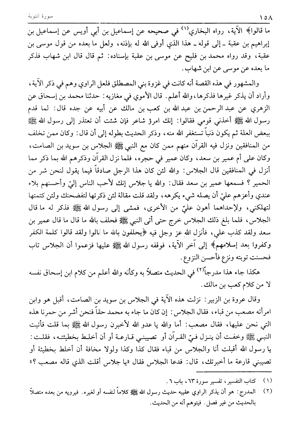 وَالْمَشْهُورُ في هذه القصة أنه كَانَتْ فِي غَزْوَةِ بَنِي الْمُصْطَلِقِ فَلَعَلَّ الرَّاوِيَ وَهِمَ فِي ذِكْرِ الْآيَةِ، وَأَرَادَ أَنْ يَذْكُرَ غيرها فذكرها، والله أعلم. قَالَ الْأُمَوِيُّ فِي مَغَازِيهِ: حَدَّثَنَا مُحَمَّدُ بْنُ إِسْحَاقَ عَنِ الزُّهْرِيِّ عَنْ عَبْدِ الرَّحْمَنِ بْنِ عَبْدِ اللَّهِ بْنِ كَعْبِ بْنِ مَالِكٍ عَنْ أبيه عَنْ جَدِّهِ قَالَ: لَمَّا قَدِمَ رَسُولُ اللَّهِ صَلَّى اللَّهُ عَلَيْهِ وَسَلَّمَ أَخَذَنِي قَوْمِي فَقَالُوا: إِنَّكَ امْرُؤٌ شَاعِرٌ فَإِنْ شِئْتَ أَنْ تَعْتَذِرَ إلى رسول الله صلى الله عليه وسلم بِبَعْضِ الْعِلَّةِ ثُمَّ يَكُونُ ذَنْبًا تَسْتَغْفِرُ اللَّهَ مِنْهُ، وَذَكَرَ الْحَدِيثَ بِطُولِهِ إِلَى أَنْ قَالَ: وَكَانَ مِمَّنْ تَخَلَّفَ مِنَ الْمُنَافِقِينَ وَنَزَلَ فِيهِ الْقُرْآنُ مِنْهُمْ مِمَّنْ كَانَ مَعَ النَّبِيِّ صَلَّى اللَّهُ عَلَيْهِ وَسَلَّمَ الْجُلَاسُ بْنُ سُوَيْدِ بْنِ الصَّامِتِ، وَكَانَ عَلَى أُمِّ عُمَيْرِ بْنِ سَعْدٍ، وَكَانَ عُمَيْرٌ فِي حِجْرِهِ، فَلَمَّا نَزَلَ الْقُرْآنُ وَذَكَرَهُمُ اللَّهُ بِمَا ذَكَرَ مِمَّا أَنْزَلَ فِي الْمُنَافِقِينَ قَالَ الْجُلَاسُ: وَاللَّهِ لَئِنْ كَانَ هَذَا الرَّجُلُ صَادِقًا فِيمَا يَقُولُ لَنَحْنُ شَرٌّ مِنَ الحمير؟ فَسَمِعَهَا عُمَيْرُ بْنُ سَعْدٍ فَقَالَ: وَاللَّهِ يَا جلاس إنك لأحب الناس إليّ وأحسنهم بلاء عندي وَأَعَزُّهُمْ عَلَيَّ أَنْ يَصِلَهُ شَيْءٌ يَكْرَهُهُ، وَلَقَدْ قُلْتَ مَقَالَةً لَئِنْ ذَكَرْتُهَا لَتَفْضَحَنَّكَ وَلَئِنْ كَتَمْتُهَا لَتُهْلِكَنِّي، وَلَإِحْدَاهُمَا أَهْوَنُ عَلَيَّ مِنَ الْأُخْرَى، فَمَشَى إلى رسول الله صلى الله عليه وسلم فَذَكَرَ لَهُ مَا قَالَ الْجُلَاسُ، فَلَمَّا بَلَغَ ذلك الجلاس خرج حَتَّى أَتَى النَّبِيَّ صَلَّى اللَّهُ عَلَيْهِ وَسَلَّمَ فَحَلَفَ بِاللَّهِ مَا قَالَ مَا قَالَ عُمَيْرُ بْنُ سَعْدٍ وَلَقَدْ كَذَبَ عَلَيَّ، فَأَنْزَلَ اللَّهُ عَزَّ وَجَلَّ فِيهِ يَحْلِفُونَ بِاللَّهِ مَا قالُوا وَلَقَدْ قالُوا كَلِمَةَ الْكُفْرِ وَكَفَرُوا بَعْدَ إِسْلامِهِمْ إِلَى آخِرِ الْآيَةِ، فَوَقَفَهُ رَسُولُ اللَّهِ صَلَّى اللَّهُ عَلَيْهِ وَسَلَّمَ عَلَيْهَا فَزَعَمُوا أَنَّ الْجُلَاسَ تَابَ فَحَسُنَتْ تَوْبَتُهُ وَنَزَعَ فَأَحْسَنَ النُّزُوعَ.