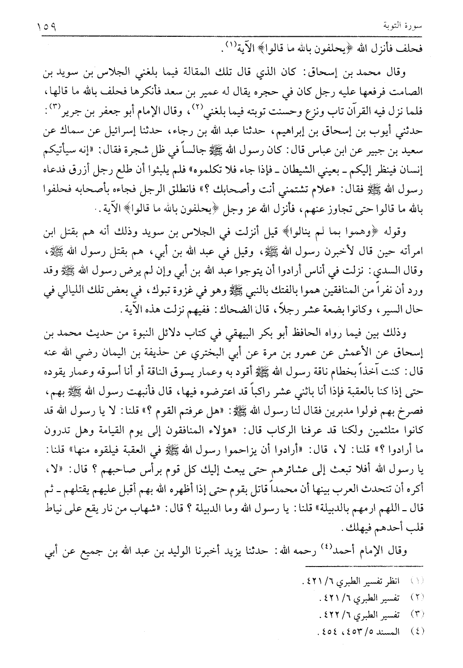 وَقَالَ مُحَمَّدُ بْنُ إِسْحَاقَ: كَانَ الَّذِي قَالَ تِلْكَ الْمَقَالَةَ فِيمَا بَلَغَنِي الْجُلَاسُ بْنُ سُوَيْدِ بْنِ الصَّامِتِ فَرَفَعَهَا عَلَيْهِ رَجُلٌ كَانَ في حجره يقال له عمير بن سعد فَأَنْكَرَهَا فَحَلَفَ بِاللَّهِ مَا قَالَهَا، فَلَمَّا نَزَلَ فِيهِ الْقُرْآنُ تَابَ وَنَزَعَ وَحَسُنَتْ تَوْبَتُهُ فِيمَا بَلَغَنِي «2» ، وَقَالَ الْإِمَامُ أَبُو جَعْفَرِ بْنُ جَرِيرٍ «3» :