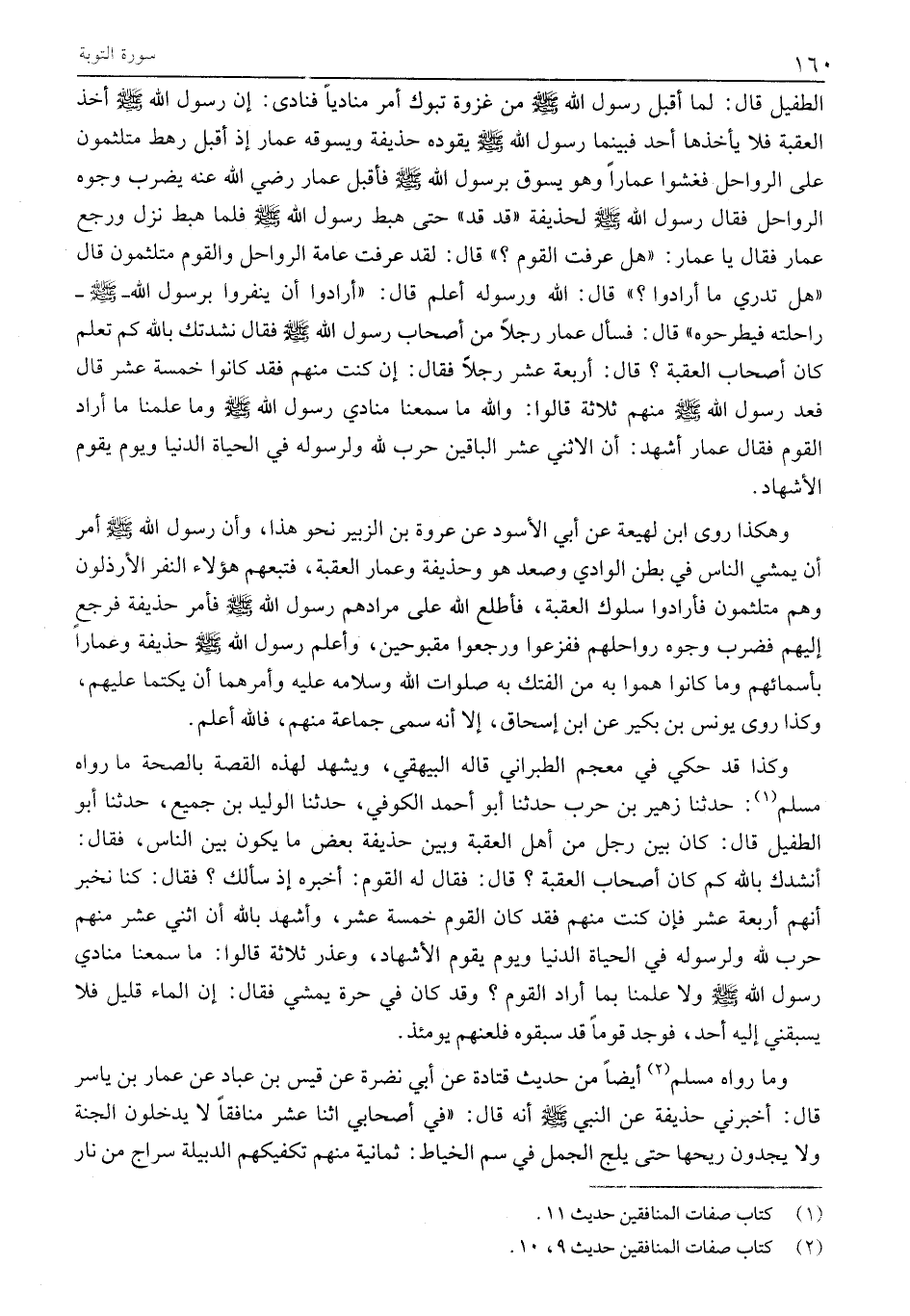 الطُّفَيْلِ قَالَ: لَمَّا أَقْبَلَ رَسُولُ اللَّهِ صَلَّى اللَّهُ عَلَيْهِ وَسَلَّمَ مِنْ غَزْوَةِ تَبُوكَ أَمَرَ مُنَادِيًا فَنَادَى: إِنَّ رَسُولَ اللَّهِ صَلَّى اللَّهُ عَلَيْهِ وَسَلَّمَ أَخَذَ الْعَقَبَةَ فَلَا يَأْخُذْهَا أَحَدٌ فَبَيْنَمَا رَسُولُ اللَّهِ صَلَّى اللَّهُ عَلَيْهِ وَسَلَّمَ يَقُودُهُ حُذَيْفَةُ وَيَسُوقُهُ عَمَّارٌ إِذْ أَقْبَلَ رَهْطٌ مُتَلَثِّمُونَ عَلَى الرَّوَاحِلِ فَغَشَوْا عَمَّارًا وَهُوَ يَسُوقُ برسول الله صلى الله عليه وسلم فأقبل عَمَّارٌ رَضِيَ اللَّهُ عَنْهُ يَضْرِبُ وُجُوهَ الرَّوَاحِلِ فَقَالَ رَسُولُ اللَّهِ صَلَّى اللَّهُ عَلَيْهِ وَسَلَّمَ لِحُذَيْفَةَ «قَدْ قَدْ» حَتَّى هَبَطَ رَسُولُ اللَّهِ صَلَّى اللَّهُ عَلَيْهِ وَسَلَّمَ فَلَمَّا هَبَطَ نَزَلَ وَرَجَعَ عَمَّارٌ فَقَالَ يَا عَمَّارُ: «هَلْ عَرَفْتَ القوم؟» قال: لقد عَرَفْتُ عَامَّةَ الرَّوَاحِلِ وَالْقَوْمُ مُتَلَثِّمُونَ قَالَ «هَلْ تَدْرِي مَا أَرَادُوا؟» قَالَ: اللَّهُ وَرَسُولُهُ أَعْلَمُ قَالَ: «أَرَادُوا أَنْ يُنْفِرُوا بِرَسُولِ اللَّهِ- صَلَّى الله عليه وسلم- راحلته فيطرحوه» قال: فسأل عمار رَجُلًا مِنْ أَصْحَابِ رَسُولِ اللَّهِ صَلَّى اللَّهُ عَلَيْهِ وَسَلَّمَ فَقَالَ نَشَدْتُكَ بِاللَّهِ كَمْ تَعْلَمُ كَانَ أصحاب العقبة؟ قال: أربعة عشر رجلا فَقَالَ: إِنْ كُنْتَ مِنْهُمْ فَقَدْ كَانُوا خَمْسَةَ عشر قال فعد رَسُولُ اللَّهِ صَلَّى اللَّهُ عَلَيْهِ وَسَلَّمَ مِنْهُمْ ثَلَاثَةً قَالُوا: وَاللَّهِ مَا سَمِعْنَا مُنَادِي رَسُولِ اللَّهِ صَلَّى اللَّهُ عَلَيْهِ وَسَلَّمَ وَمَا عَلِمْنَا مَا أَرَادَ الْقَوْمُ فَقَالَ عَمَّارٌ أَشْهَدُ: أَنَّ الِاثْنَيْ عَشَرَ الْبَاقِينَ حَرْبٌ لِلَّهِ وَلِرَسُولِهِ فِي الْحَيَاةِ الدُّنْيَا وَيَوْمَ يَقُومُ الْأَشْهَادُ.