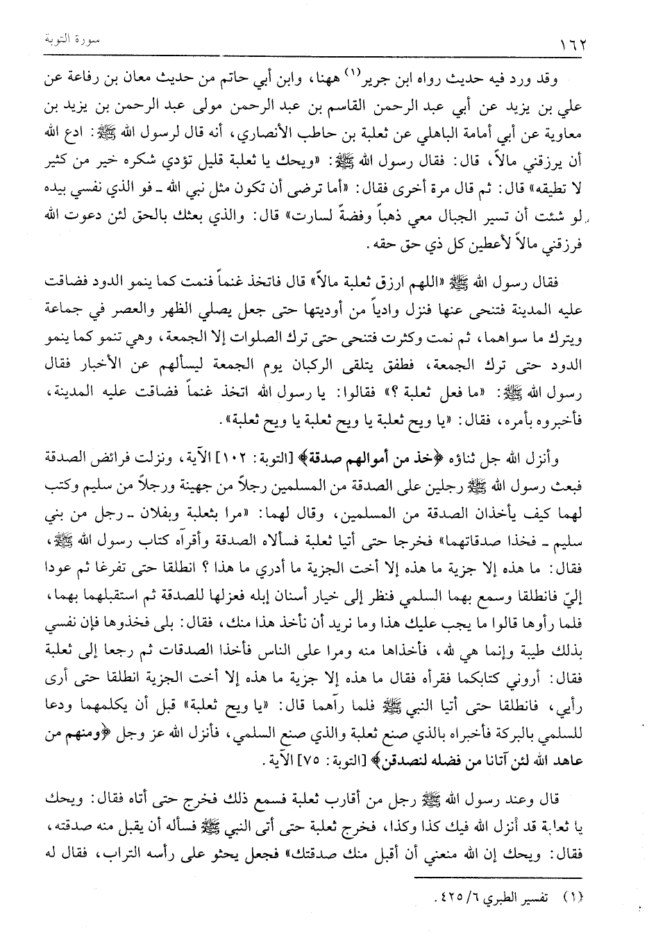 وَأَنْزَلَ اللَّهُ جل ثناؤه خُذْ مِنْ أَمْوالِهِمْ صَدَقَةً [التوبة: 102] الآية، ونزلت فَرَائِضُ الصَّدَقَةِ فَبَعَثَ رَسُولُ اللَّهِ صَلَّى اللَّهُ عَلَيْهِ وَسَلَّمَ رجلين على الصدقة من المسلمين رَجُلًا مِنْ جُهَيْنَةَ وَرَجُلًا مِنْ سُلَيْمٍ وَكَتَبَ لَهُمَا كَيْفَ يَأْخُذَانِ الصَّدَقَةَ مِنَ الْمُسْلِمِينَ، وَقَالَ لَهُمَا: «مُرَّا بِثَعْلَبَةَ وَبِفُلَانٍ- رَجُلٌ مِنْ بَنِي سُلَيْمٍ- فَخُذَا صَدَقَاتِهِمَا» فَخَرَجَا حَتَّى أَتَيَا ثَعْلَبَةَ فَسَأَلَاهُ الصَّدَقَةَ وَأَقْرَآهُ كِتَابَ رَسُولِ اللَّهِ صَلَّى اللَّهُ عَلَيْهِ وَسَلَّمَ، فَقَالَ: مَا هَذِهِ إِلَّا جِزْيَةٌ مَا هَذِهِ إِلَّا أُخْتُ الْجِزْيَةِ مَا أَدْرِي مَا هَذَا؟ انْطَلِقَا حَتَّى تَفْرُغَا ثُمَّ عُودَا إِلَيَّ فَانْطَلَقَا وَسَمِعَ بِهِمَا السُّلَمِيُّ فَنَظَرَ إِلَى خِيَارِ أَسْنَانِ إِبِلِهِ فَعَزْلَهَا لِلصَّدَقَةِ ثُمَّ استقبلهما بهما، فَلَمَّا رَأَوْهَا قَالُوا مَا يَجِبُ عَلَيْكَ هَذَا وما نريد أن نأخذ هذا منك، فقال: بَلَى فَخُذُوهَا فَإِنَّ نَفْسِي بِذَلِكَ طَيِّبَةٌ وَإِنَّمَا هي لله، فأخذاها منه ومرا على الناس فأخذا الصدقات ثم رجعا إلى ثعلبة فقال: أروني كتابكما فقرأه فَقَالَ مَا هَذِهِ إِلَّا جِزْيَةٌ مَا هَذِهِ إِلَّا أُخْتُ الْجِزْيَةِ انْطَلِقَا حَتَّى أَرَى رَأْيِي، فَانْطَلَقَا حَتَّى أَتَيَا النَّبِيَّ صَلَّى اللَّهُ عَلَيْهِ وَسَلَّمَ فَلَمَّا رَآهُمَا قَالَ: «يَا وَيْحَ ثَعْلَبَةَ» قَبْلَ أَنْ يُكَلِّمَهُمَا وَدَعَا لِلسُّلَمِيِّ بِالْبَرَكَةِ فَأَخْبَرَاهُ بِالَّذِي صَنَعَ ثَعْلَبَةُ وَالَّذِي صَنَعَ السُّلَمِيُّ، فَأَنْزَلَ اللَّهُ عَزَّ وَجَلَّ وَمِنْهُمْ مَنْ عاهَدَ اللَّهَ لَئِنْ آتانا مِنْ فَضْلِهِ لَنَصَّدَّقَنَّ [التوبة: 75] الآية.