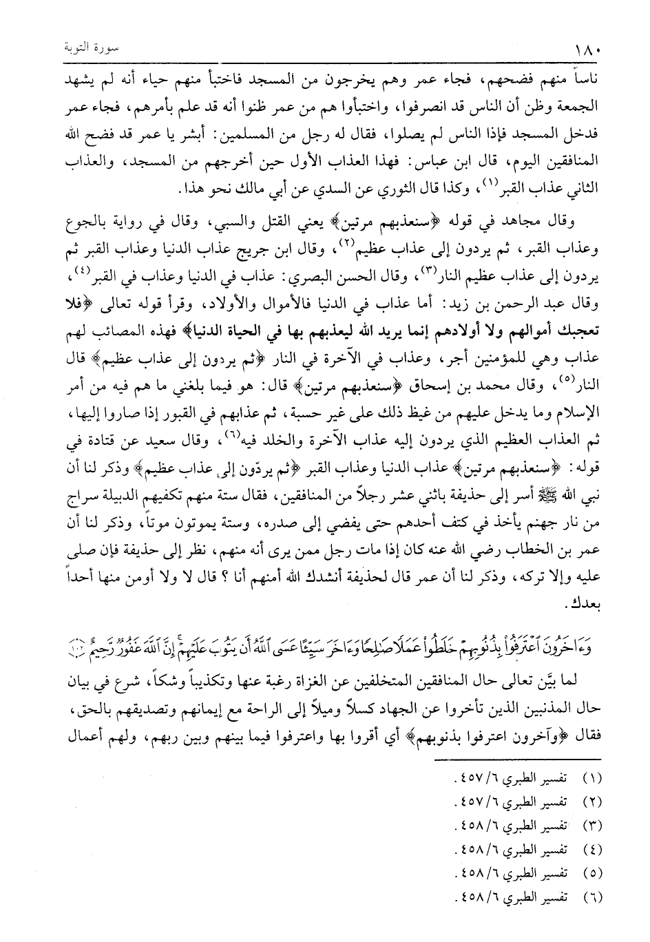 وَقَالَ مُجَاهِدٌ في قوله سَنُعَذِّبُهُمْ مَرَّتَيْنِ يعني القتل والسبي، وَقَالَ فِي رِوَايَةٍ بِالْجُوعِ وَعَذَابِ الْقَبْرِ، ثُمَّ يُرَدُّونَ إِلَى عَذَابٍ عَظِيمٍ «2» ، وَقَالَ ابْنُ جُرَيْجٍ عذاب الدنيا وعذاب القبر ثم يردون إلى عذاب عظيم النَّارِ «3» ، وَقَالَ الْحَسَنُ الْبَصْرِيُّ: عَذَابٌ فِي الدُّنْيَا وَعَذَابٌ فِي الْقَبْرِ «4» ، وَقَالَ عَبْدُ الرَّحْمَنِ بْنُ زَيْدٍ: أَمَّا عَذَابٌ فِي الدُّنْيَا فَالْأَمْوَالُ وَالْأَوْلَادُ، وقرأ قوله تَعَالَى فَلا تُعْجِبْكَ أَمْوالُهُمْ وَلا أَوْلادُهُمْ إِنَّما يُرِيدُ اللَّهُ لِيُعَذِّبَهُمْ بِها فِي الْحَياةِ الدُّنْيا فَهَذِهِ الْمَصَائِبُ لَهُمْ عَذَابٌ وَهِيَ لِلْمُؤْمِنِينَ أَجْرٌ، وَعَذَابٌ فِي الْآخِرَةِ فِي النَّارِ ثُمَّ يُرَدُّونَ إِلى عَذابٍ عَظِيمٍ قَالَ النَّارُ «5» ، وَقَالَ مُحَمَّدُ بْنُ إِسْحَاقَ سَنُعَذِّبُهُمْ مَرَّتَيْنِ قَالَ: هُوَ فِيمَا بَلَغَنِي مَا هُمْ فِيهِ مِنْ أَمْرِ الْإِسْلَامِ وَمَا يَدْخُلُ عَلَيْهِمْ مِنْ غَيْظِ ذَلِكَ عَلَى غَيْرِ حِسْبَةٍ، ثُمَّ عَذَابُهُمْ فِي الْقُبُورِ إِذَا صَارُوا إِلَيْهَا، ثُمَّ الْعَذَابُ الْعَظِيمُ الَّذِي يُرَدُّونَ إِلَيْهِ عَذَابُ الْآخِرَةِ وَالْخَلَدِ فِيهِ «6» ، وَقَالَ سَعِيدٌ عَنْ قَتَادَةَ فِي قَوْلِهِ: سَنُعَذِّبُهُمْ مَرَّتَيْنِ عَذَابُ الدنيا وعذاب القبر ثُمَّ يُرَدُّونَ إِلى عَذابٍ عَظِيمٍ وَذُكِرَ لَنَا أَنَّ نَبِيَّ اللَّهِ صَلَّى اللَّهُ عَلَيْهِ وَسَلَّمَ أَسَرَّ إِلَى حُذَيْفَةَ بِاثْنَيْ عَشَرَ رجلا من المنافقين، فقال ستة منهم تكفيهم الدُّبَيْلَةُ سِرَاجٌ مِنْ نَارِ جَهَنَّمَ يَأْخُذُ فِي كَتِفِ أَحَدِهِمْ حَتَّى يُفْضِيَ إِلَى صَدْرِهِ، وَسِتَّةٌ يَمُوتُونَ مَوْتًا، وَذُكِرَ لَنَا أَنَّ عُمَرَ بْنَ الْخَطَّابِ رَضِيَ اللَّهُ عَنْهُ كَانَ إِذَا مَاتَ رَجُلٌ مِمَّنْ يُرَى أَنَّهُ مِنْهُمْ، نَظَرَ إِلَى حُذَيْفَةَ فَإِنْ صَلَّى عَلَيْهِ وَإِلَّا تَرَكَهُ، وَذُكِرَ لنا أن عمر قال لحذيفة أنشدك الله أَمِنْهُمْ أَنَا؟ قَالَ لَا وَلَا أُومِنُ مِنْهَا أحدا بعدك.
