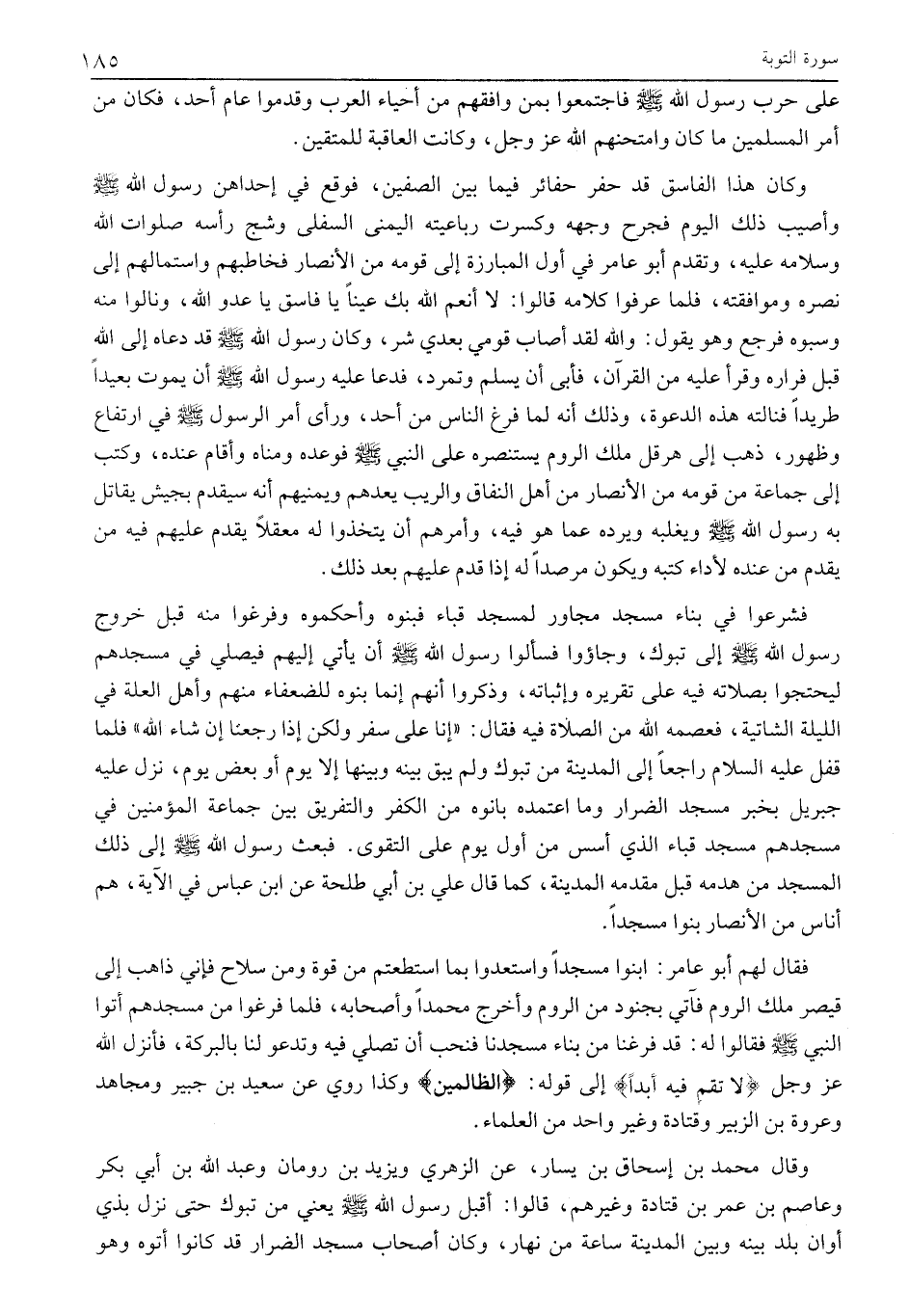 فَشَرَعُوا فِي بِنَاءِ مَسْجِدٍ مُجَاوِرٍ لِمَسْجِدِ قُبَاءٍ فبنوه وأحكموه وفرغوا منه قبل خُرُوجِ رَسُولِ اللَّهِ صَلَّى اللَّهُ عَلَيْهِ وَسَلَّمَ إِلَى تَبُوكَ، وَجَاءُوا فَسَأَلُوا رَسُولَ اللَّهِ صَلَّى اللَّهُ عَلَيْهِ وَسَلَّمَ أَنْ يَأْتِيَ إِلَيْهِمْ فَيُصَلِّيَ في مسجدهم ليحتجوا بصلاته فِيهِ عَلَى تَقْرِيرِهِ وَإِثْبَاتِهِ، وَذَكَرُوا أَنَّهُمْ إِنَّمَا بَنَوْهُ لِلضُّعَفَاءِ مِنْهُمْ وَأَهْلِ الْعِلَّةِ فِي اللَّيْلَةِ الشَّاتِيَةِ، فَعَصَمَهُ اللَّهُ مِنَ الصَّلَاةِ فِيهِ فَقَالَ: «إِنَّا عَلَى سَفَرٍ وَلَكِنْ إِذَا رَجَعْنَا إِنْ شَاءَ اللَّهُ» فَلَمَّا قَفَلَ عَلَيْهِ السَّلَامُ رَاجِعًا إِلَى الْمَدِينَةِ مِنْ تَبُوكَ وَلَمْ يَبْقَ بَيْنَهُ وَبَيْنَهَا إِلَّا يَوْمٌ أَوْ بَعْضُ يَوْمٍ، نَزَلَ عليه جبريل بِخَبَرِ مَسْجِدِ الضِّرَارِ وَمَا اعْتَمَدَهُ بَانُوهُ مِنَ الْكُفْرِ وَالتَّفْرِيقِ بَيْنَ جَمَاعَةِ الْمُؤْمِنِينَ فِي مَسْجِدِهِمْ مسجد قباء الذي أسس من أول يوم عَلَى التَّقْوَى. فَبَعَثَ رَسُولُ اللَّهِ صَلَّى اللَّهُ عَلَيْهِ وَسَلَّمَ إِلَى ذَلِكَ الْمَسْجِدِ مَنْ هَدَمَهُ قَبْلَ مَقْدَمِهِ الْمَدِينَةَ، كَمَا قَالَ عَلِيُّ بْنُ أَبِي طَلْحَةَ عَنِ ابْنِ عَبَّاسٍ فِي الْآيَةِ، هم أناس من الأنصار بنوا مَسْجِدًا.