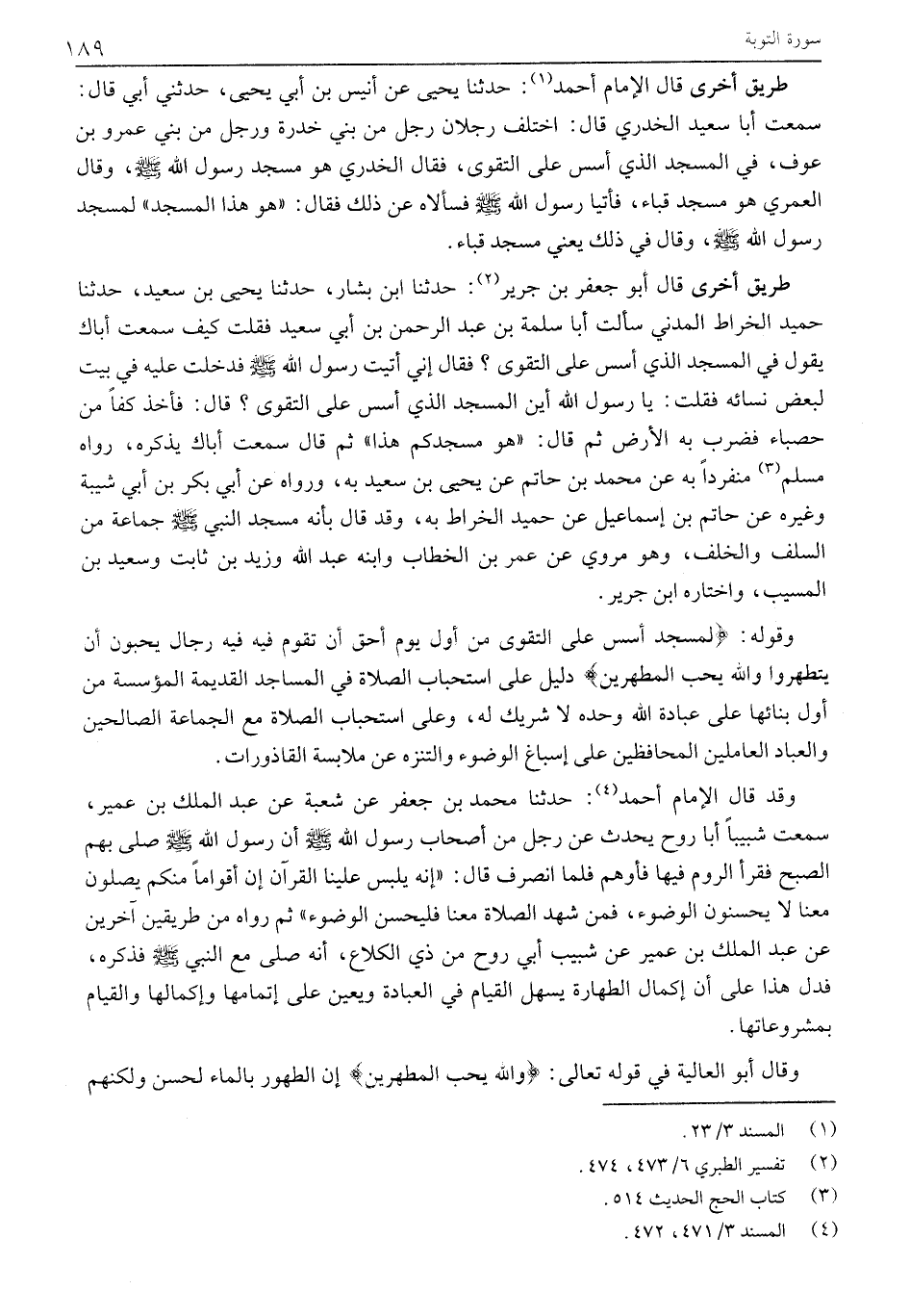 طَرِيقٌ أُخْرَى قَالَ أَبُو جَعْفَرِ بْنُ جَرِيرٍ «2» : حَدَّثَنَا ابْنُ بَشَّارٍ، حَدَّثَنَا يَحْيَى بْنُ سَعِيدٍ، حَدَّثَنَا حُمَيْدٌ الْخَرَّاطُ الْمَدَنِيُّ سَأَلْتُ أَبَا سَلَمَةَ بْنَ عَبْدِ الرَّحْمَنِ بْنِ أَبِي سَعِيدٍ فَقُلْتُ كَيْفَ سَمِعْتُ أَبَاكَ يَقُولُ فِي الْمَسْجِدِ الَّذِي أُسِّسَ عَلَى التَّقْوَى؟ فَقَالَ إني أَتَيْتُ رَسُولَ اللَّهِ صَلَّى اللَّهُ عَلَيْهِ وَسَلَّمَ فَدَخَلْتُ عَلَيْهِ فِي بَيْتٍ لِبَعْضِ نِسَائِهِ فَقُلْتُ: يَا رَسُولَ اللَّهِ أَيْنَ الْمَسْجِدُ الَّذِي أُسِّسَ عَلَى التَّقْوَى؟ قَالَ: فَأَخَذَ كَفًّا مِنْ حَصْبَاءَ فَضَرَبَ بِهِ الْأَرْضَ ثُمَّ قَالَ: «هُوَ مَسْجِدُكُمْ هذا» ثم قال سَمِعْتُ أَبَاكَ يَذْكُرُهُ، رَوَاهُ مُسْلِمٌ «3» مُنْفَرِدًا بِهِ عَنْ مُحَمَّدِ بْنِ حَاتِمٍ عَنْ يَحْيَى بْنِ سَعِيدٍ بِهِ، وَرَوَاهُ عَنْ أَبِي بَكْرِ بْنِ أَبِي شَيْبَةَ وَغَيْرِهِ عَنْ حَاتِمِ بْنِ إِسْمَاعِيلَ عَنْ حُمَيْدٍ الْخَرَّاطِ بِهِ، وَقَدْ قَالَ بِأَنَّهُ مَسْجِدُ النَّبِيِّ صَلَّى اللَّهُ عَلَيْهِ وَسَلَّمَ جَمَاعَةٌ مِنَ السَّلَفِ وَالْخَلَفِ، وَهُوَ مَرْوِيٌّ عَنْ عُمَرَ بْنِ الْخَطَّابِ وَابْنِهِ عَبْدِ اللَّهِ وَزَيْدِ بْنِ ثَابِتٍ وَسَعِيدِ بْنِ الْمُسَيَّبِ، وَاخْتَارَهُ ابْنُ جَرِيرٍ.