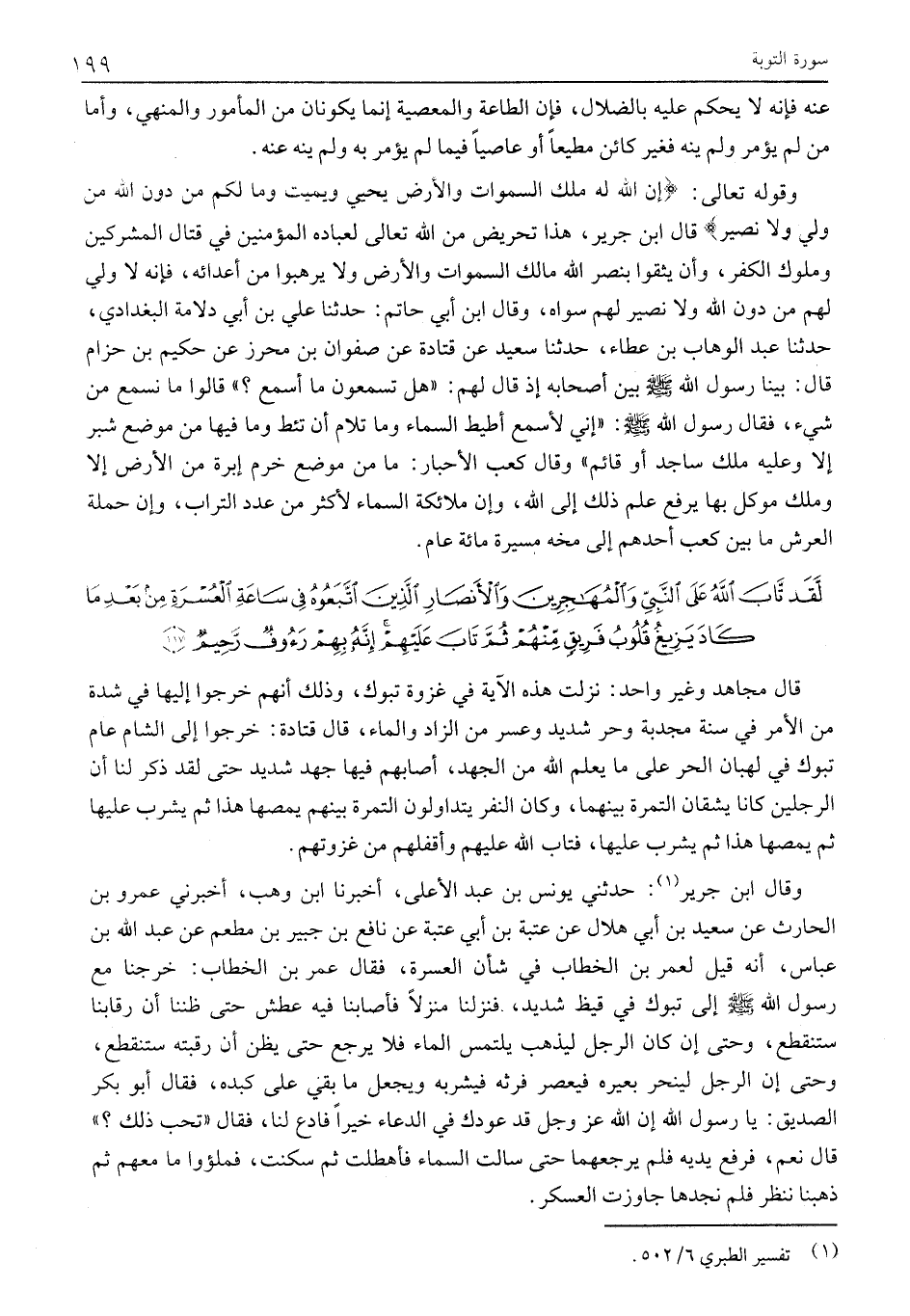 لَقَدْ تابَ اللَّهُ عَلَى النَّبِيِّ وَالْمُهاجِرِينَ وَالْأَنْصارِ الَّذِينَ اتَّبَعُوهُ فِي ساعَةِ الْعُسْرَةِ مِنْ بَعْدِ مَا كادَ يَزِيغُ قُلُوبُ فَرِيقٍ مِنْهُمْ ثُمَّ تابَ عَلَيْهِمْ إِنَّهُ بِهِمْ رَؤُفٌ رَحِيمٌ (117)